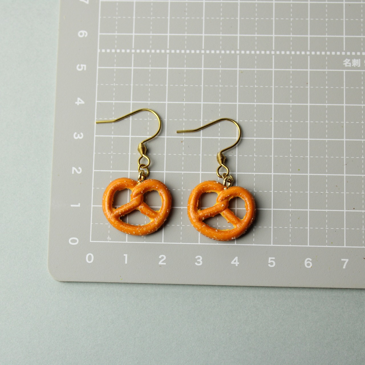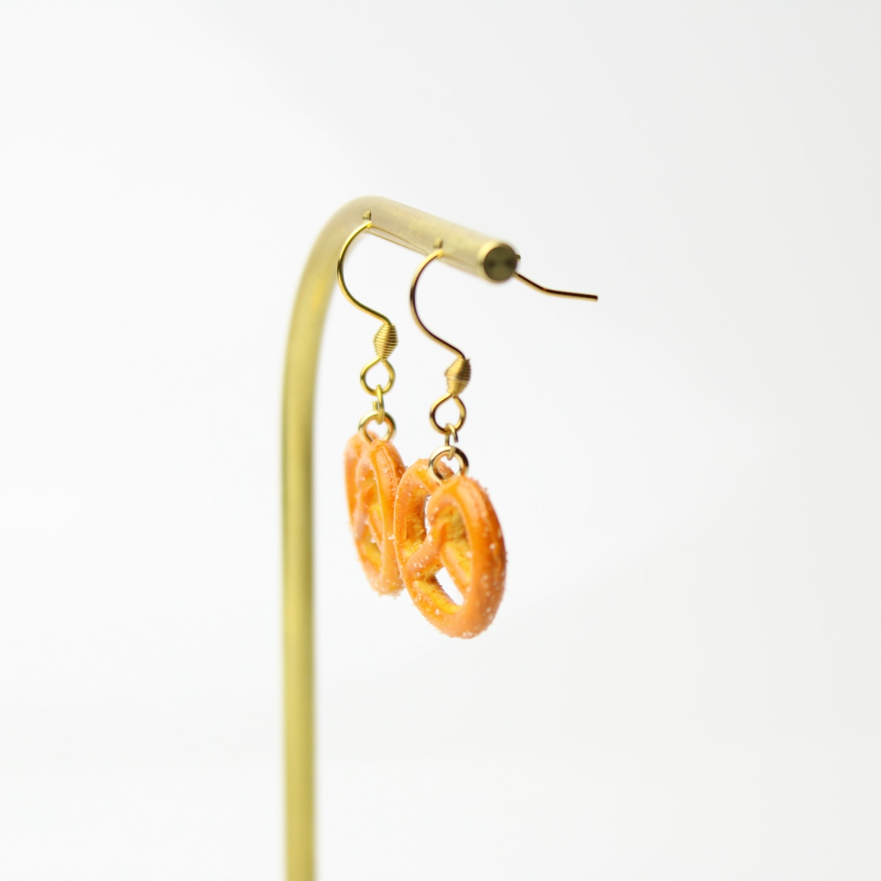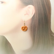 まるで本物のプレッツェルのお菓子を耳につけているような、香ばしい色合いとツヤ感にこだわって作った、樹脂粘土製のミニチュアピアスです。
