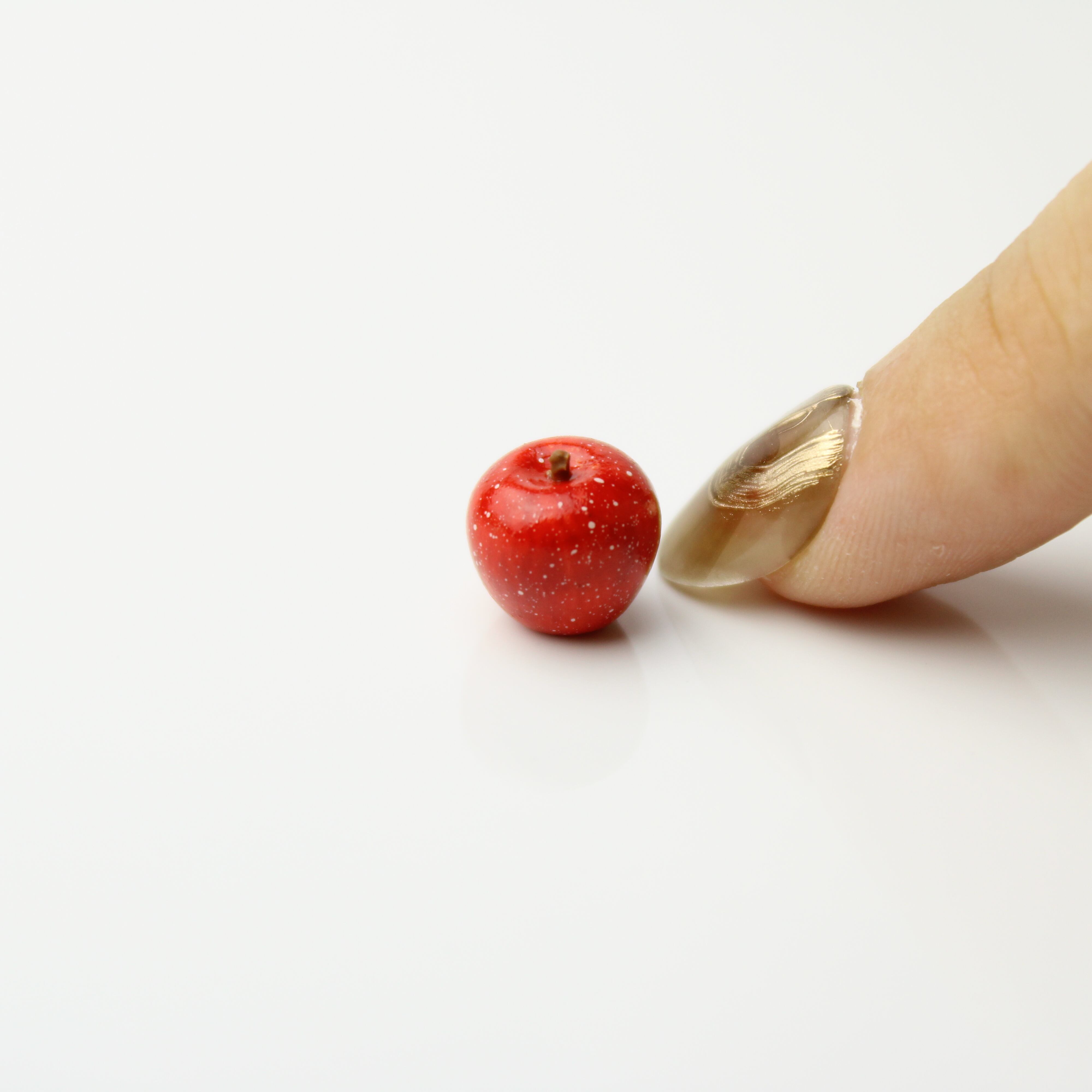 ・樹脂粘土から指先だけで慎重に丁寧に形を整えた後、細い棒状のものを使いリンゴの凹みを作ります。