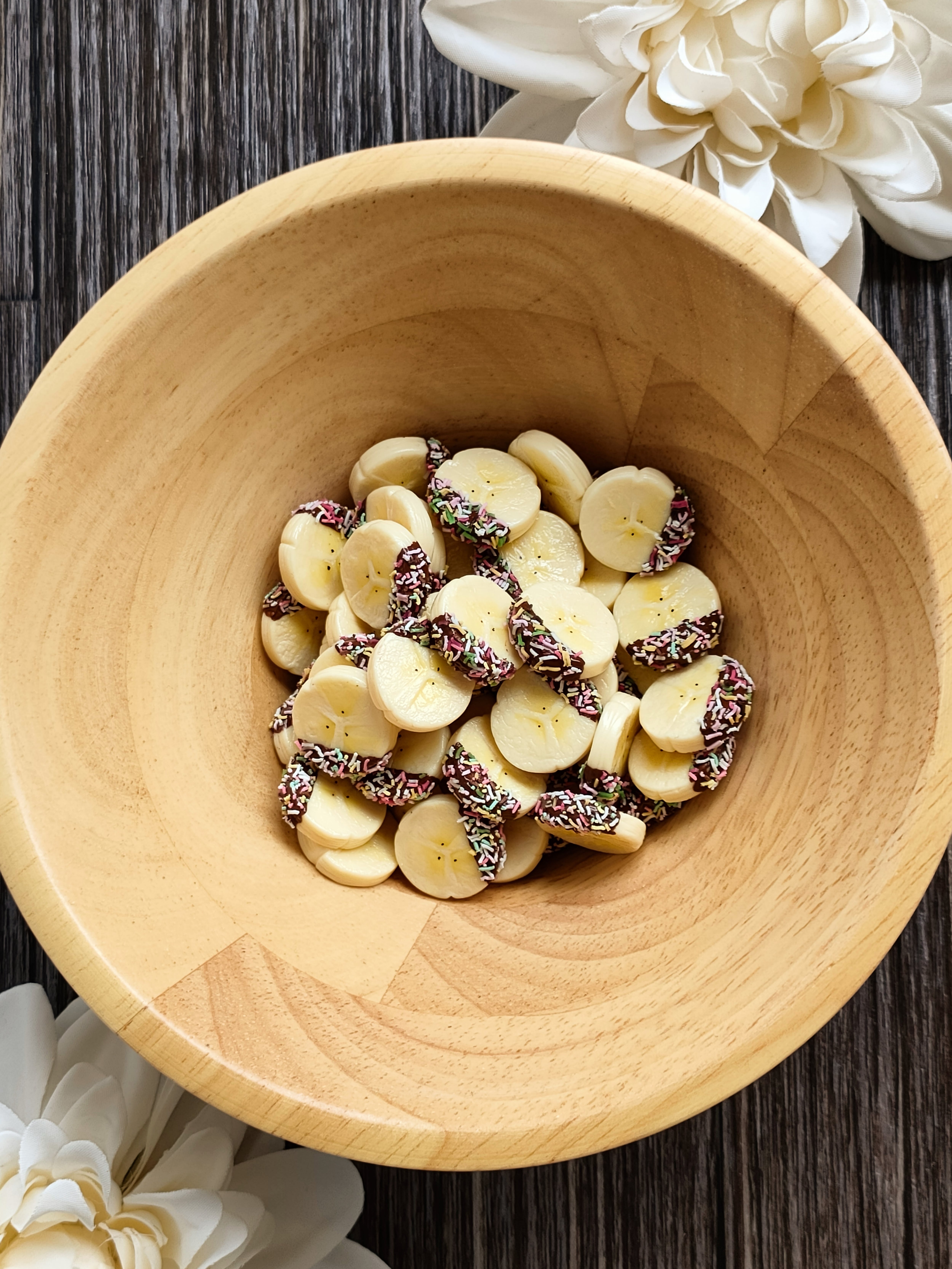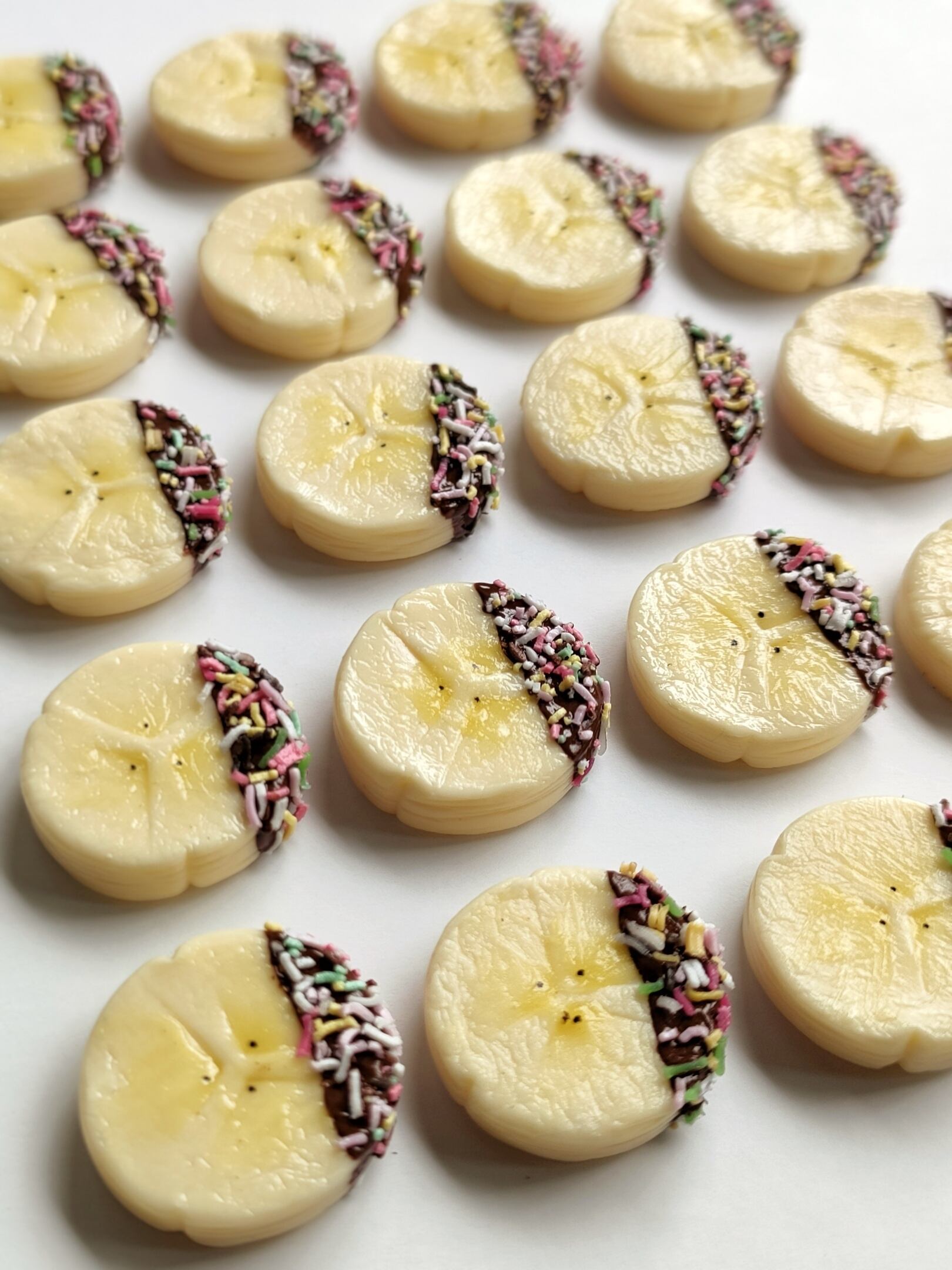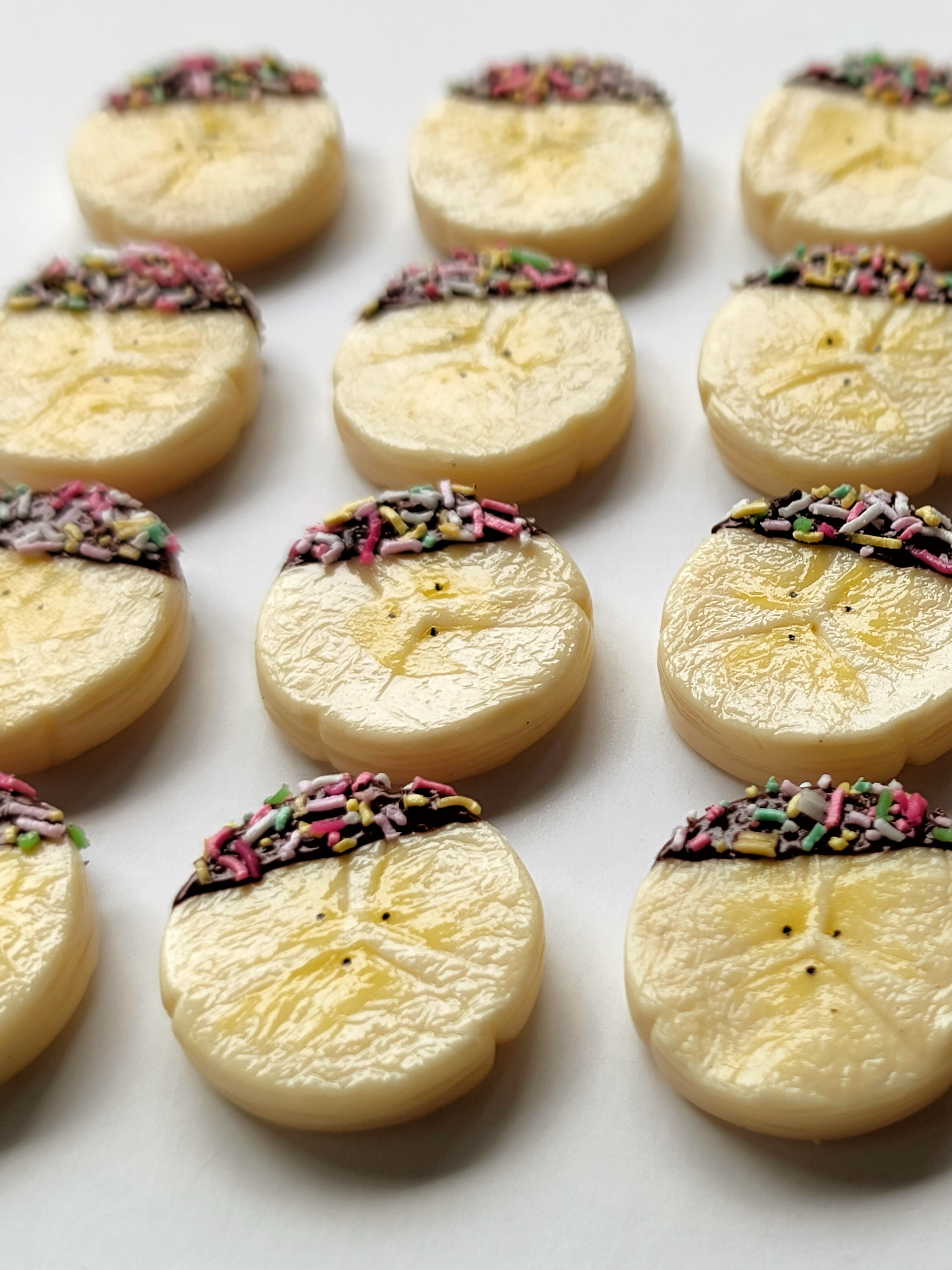 ツヤツヤのチョコレートとチョコスプレーに包まれた瑞々しいバナナ
