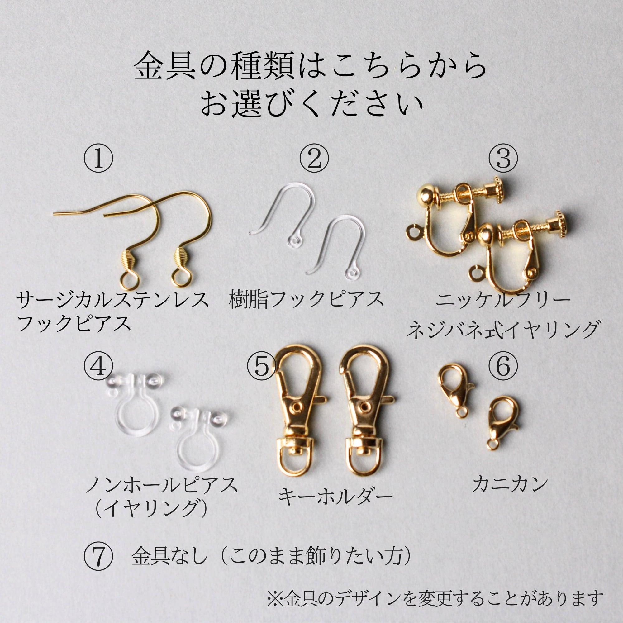 ピアス、イヤリング、チャームなど、お好きな金具をお選びいただけます