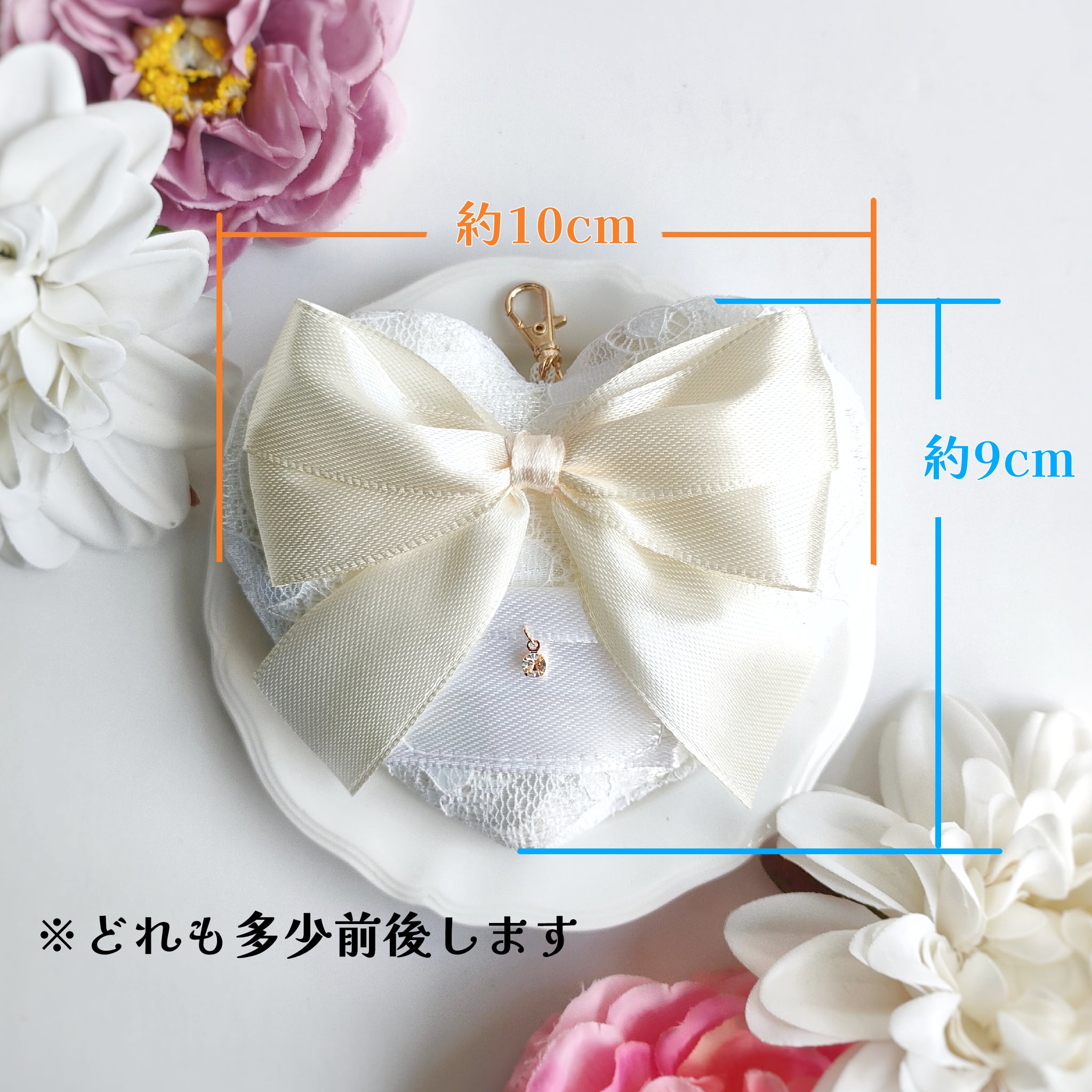 わんちゃんの首にネックレスのように付ける為のリボンは、長さ約90cmを無料でおまけとしてお付けいたします。お好きなリボンで代用いただいても可愛いと思います♡