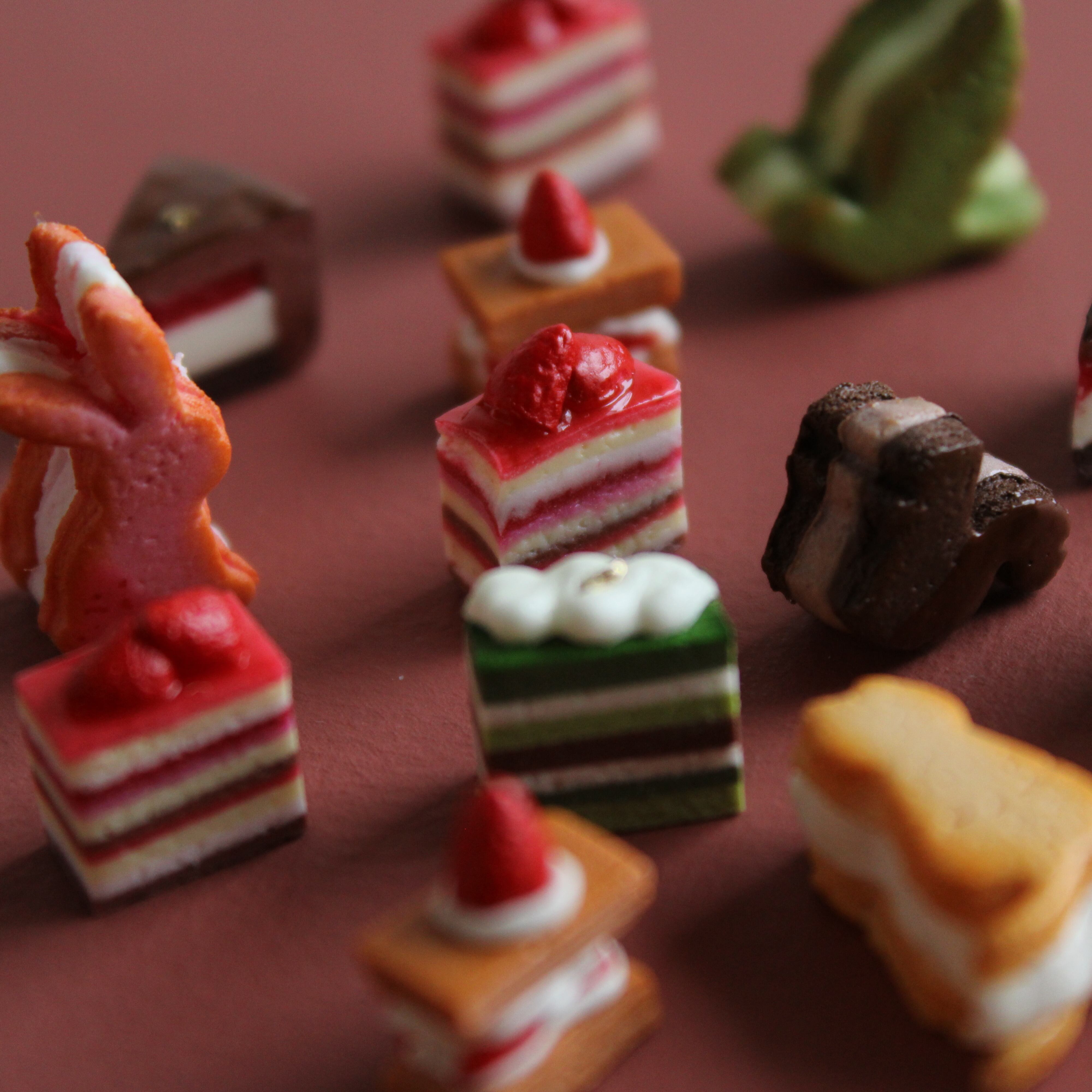 この苺のケーキは、樹脂粘土や絵の具などを使用し、細部までこだわり仕上げました