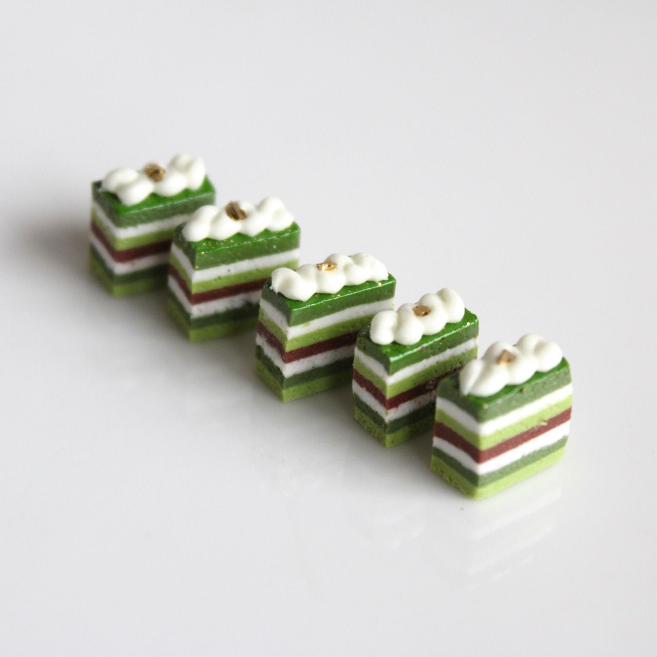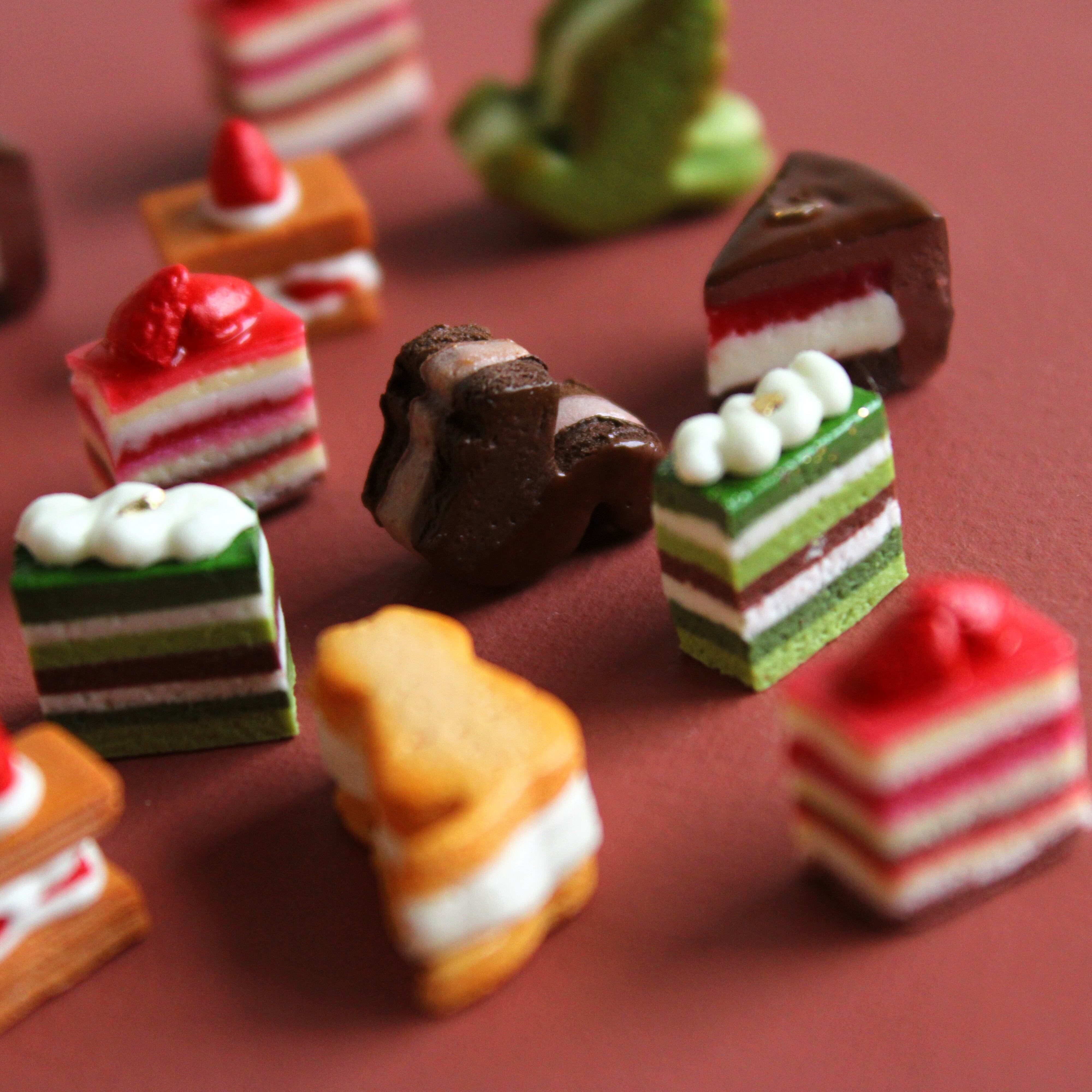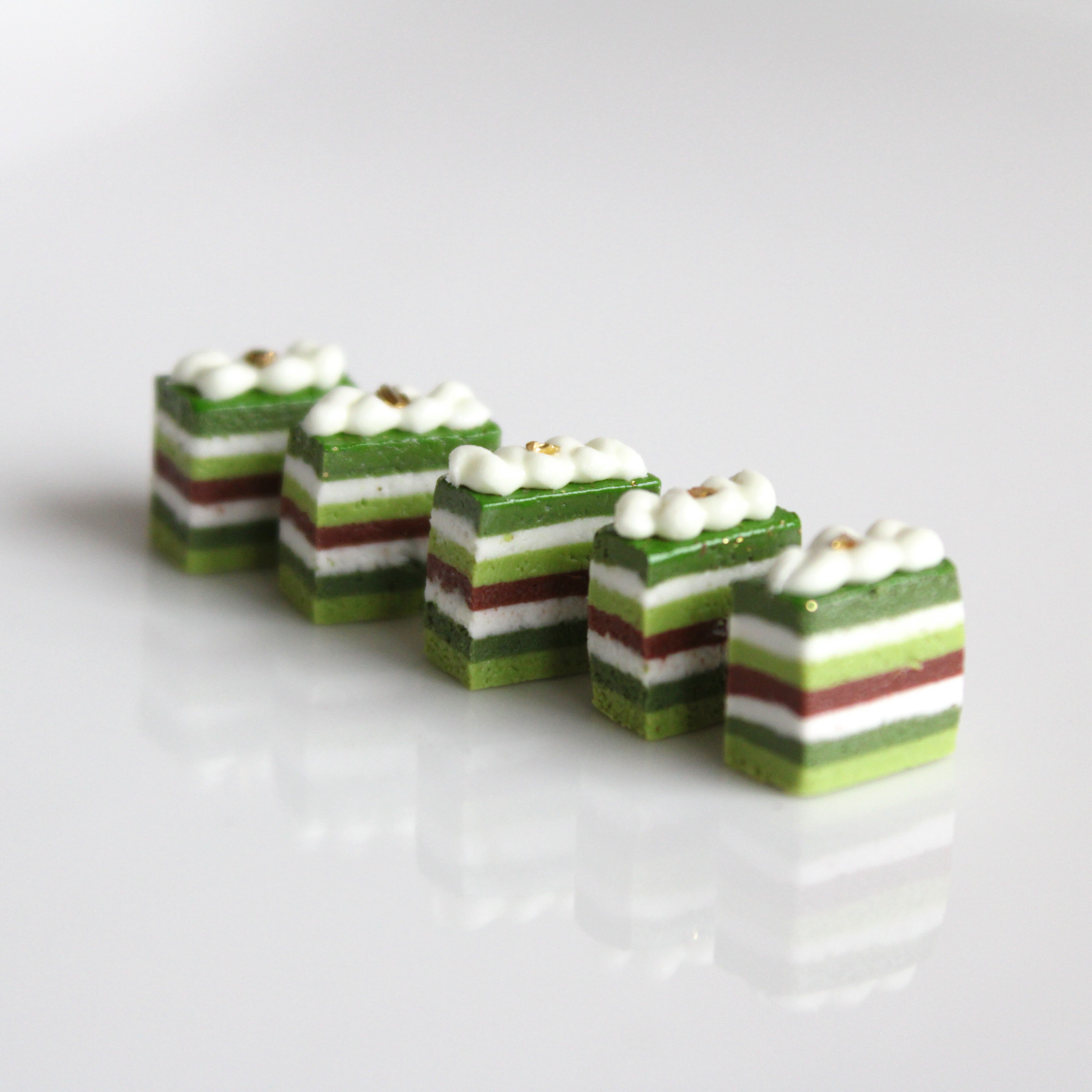 この抹茶のオペラケーキは、樹脂粘土や絵の具などを使用し、細部までこだわり仕上げました