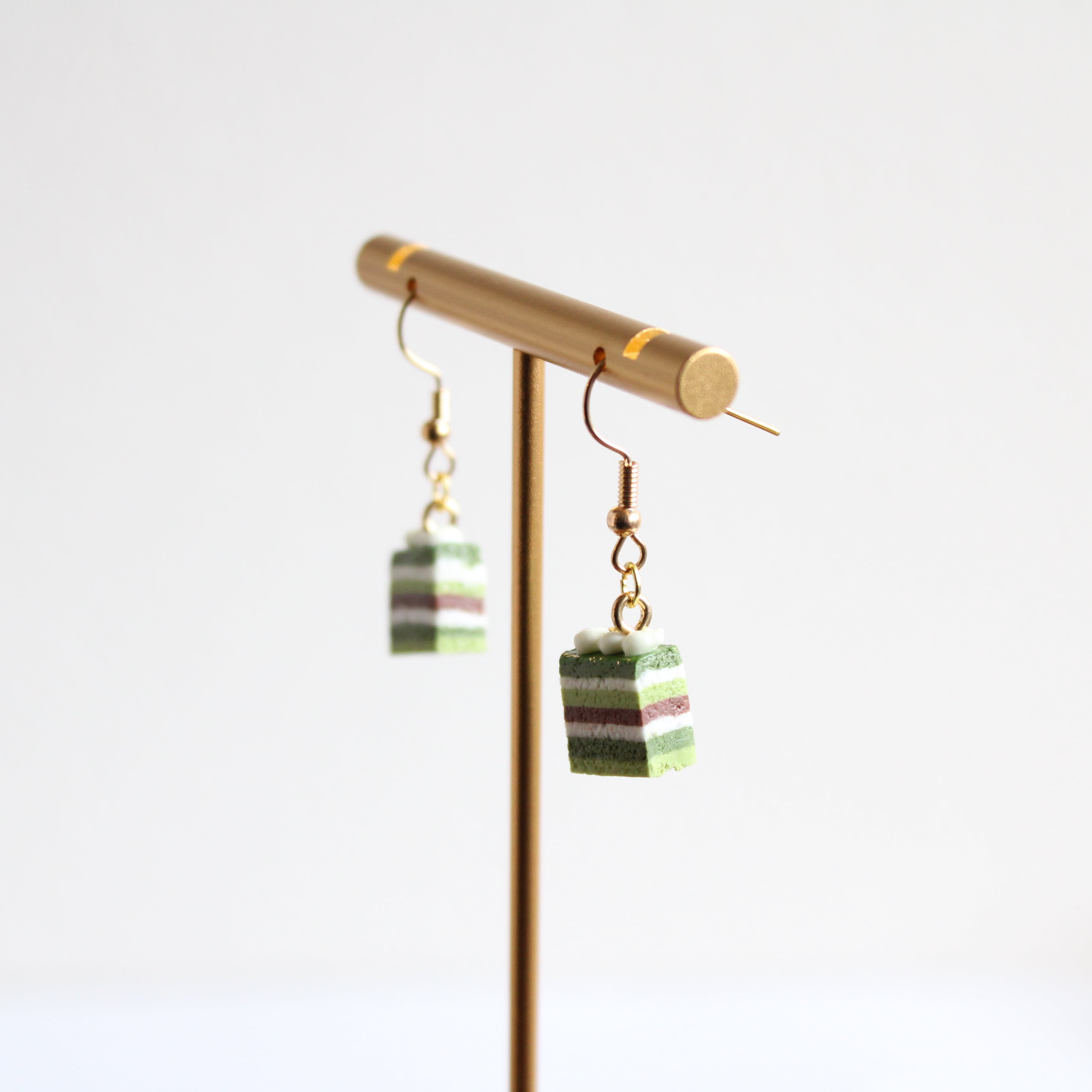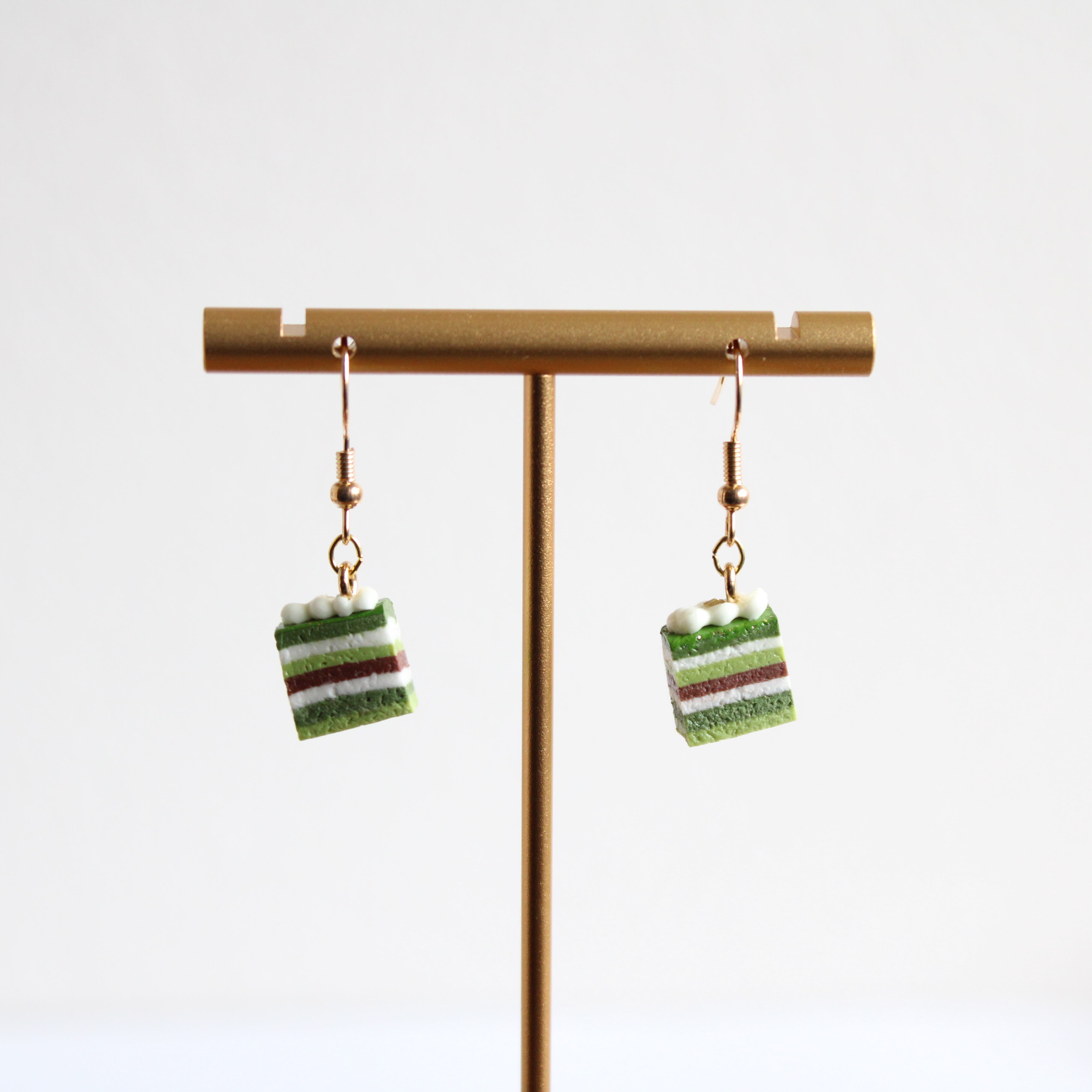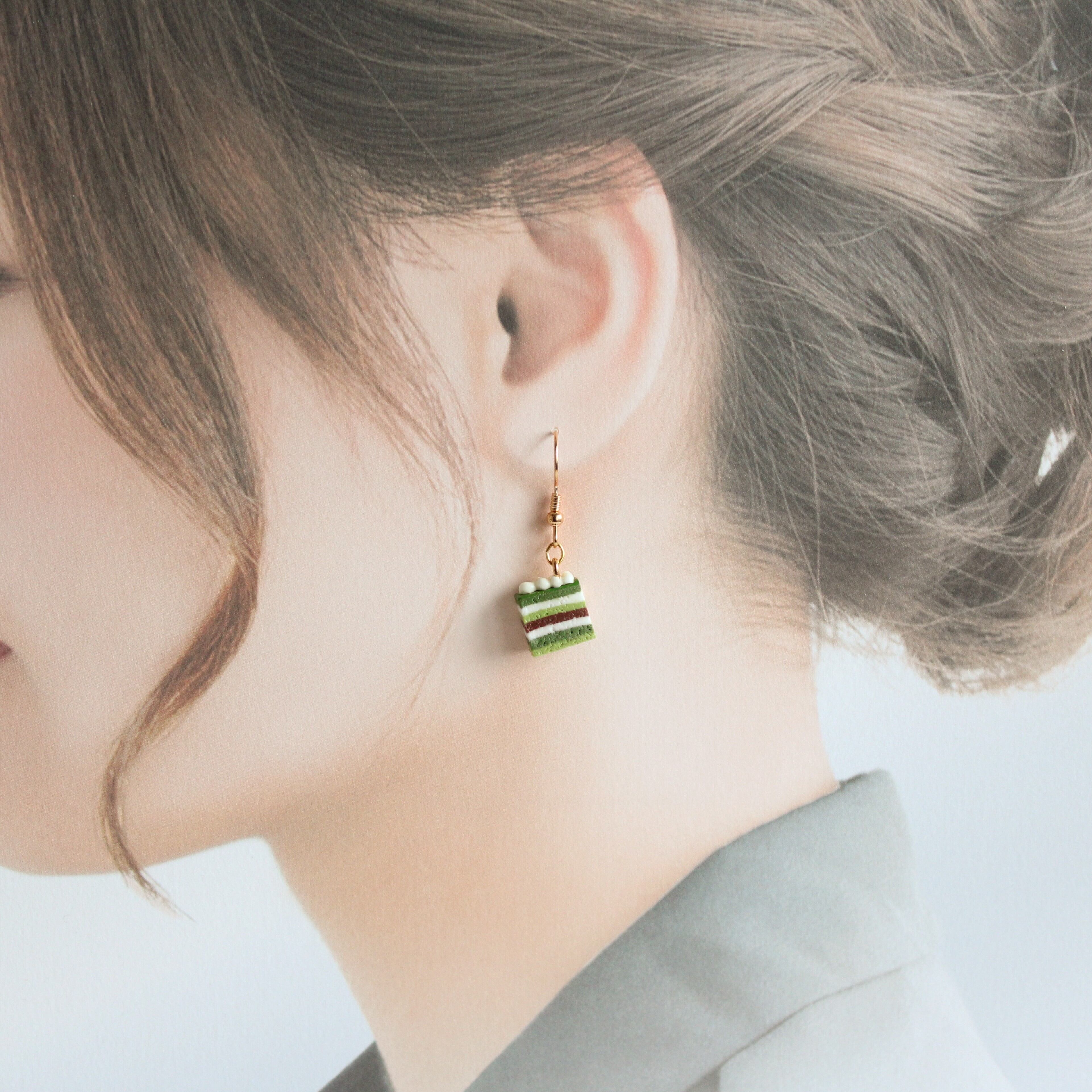 抹茶のオペラケーキピアス - 美味しさと芸術が融合したアクセサリー(ピアス / イヤリング/チャーム/ストラップ/キーホルダー) ミニチュア スイーツ ハンドメイド作品