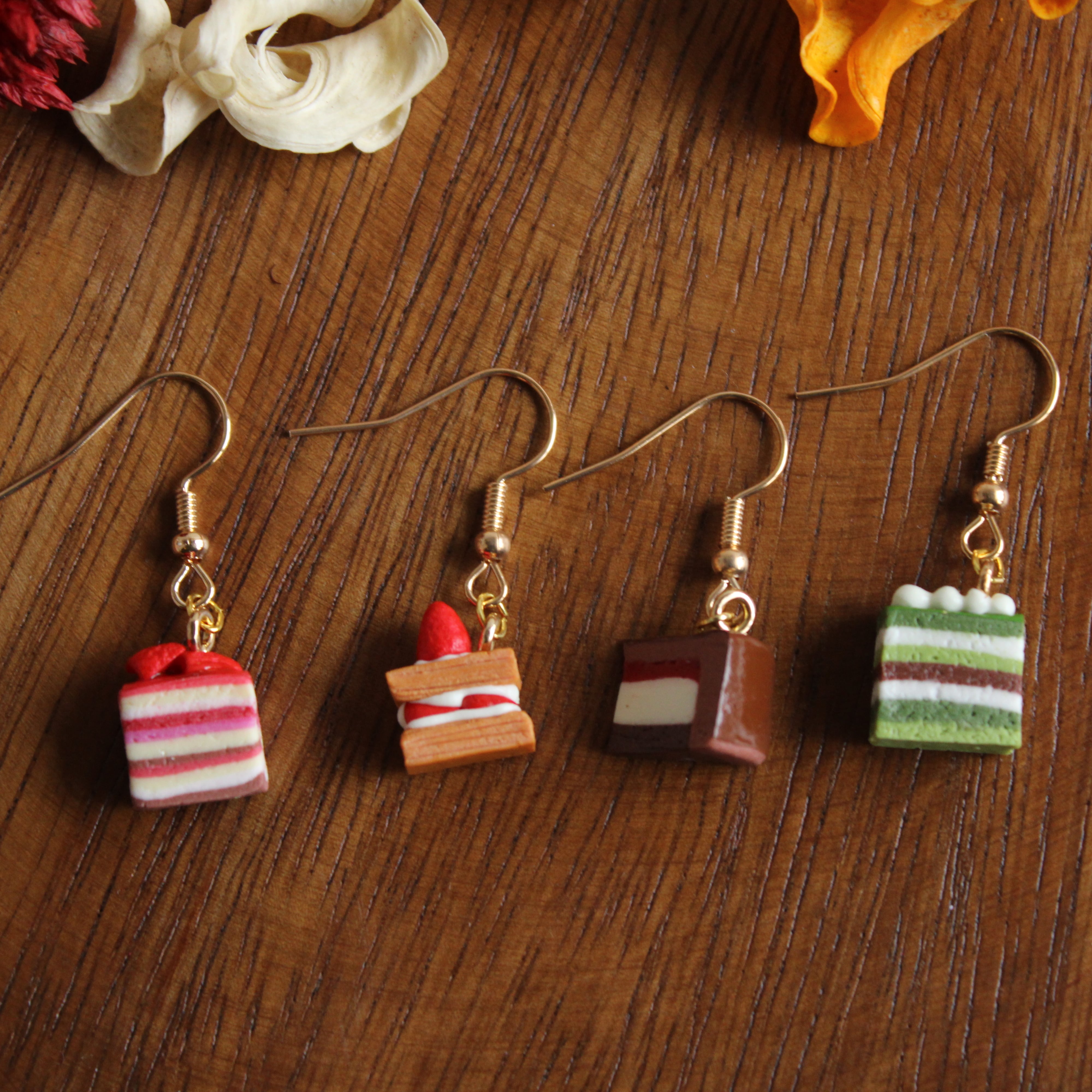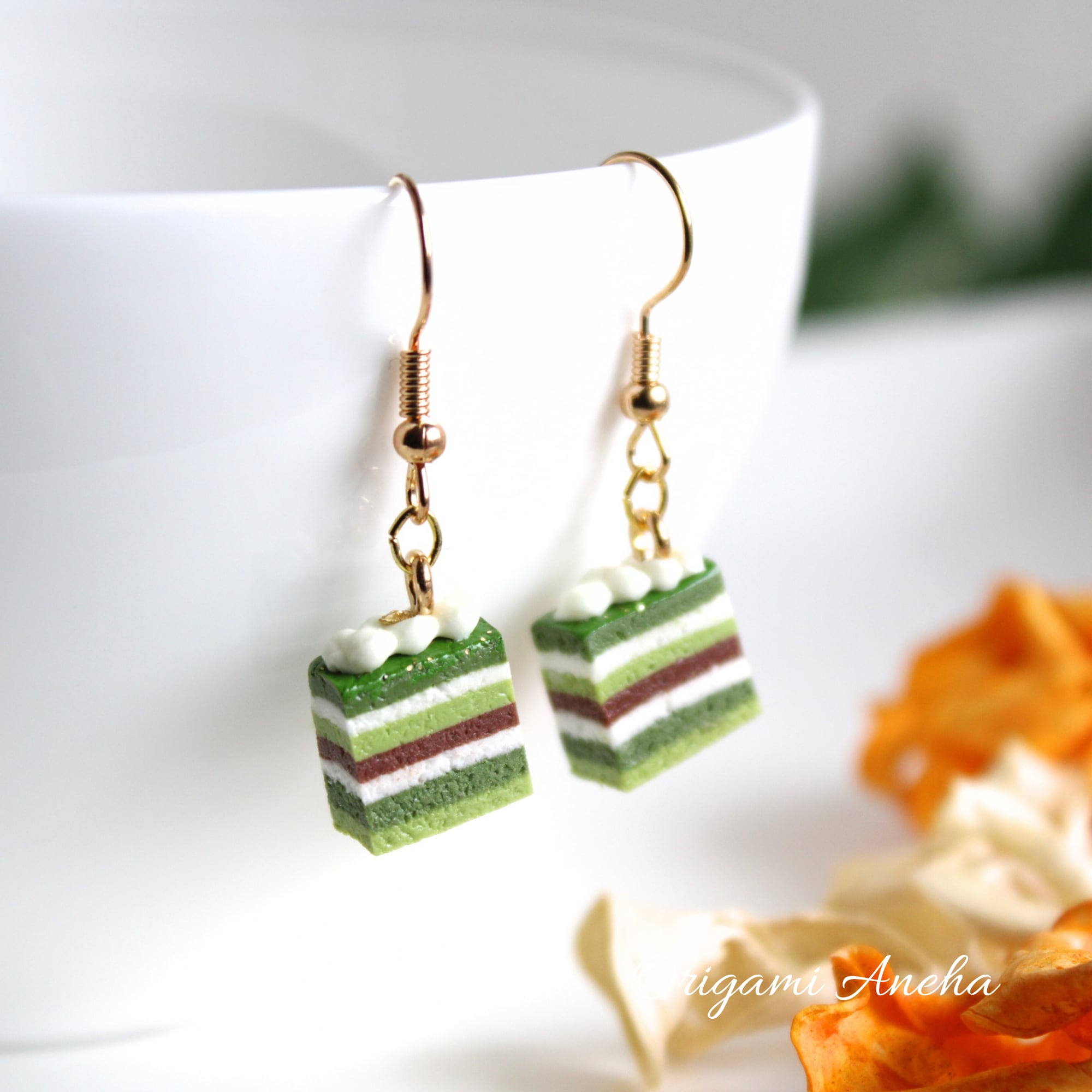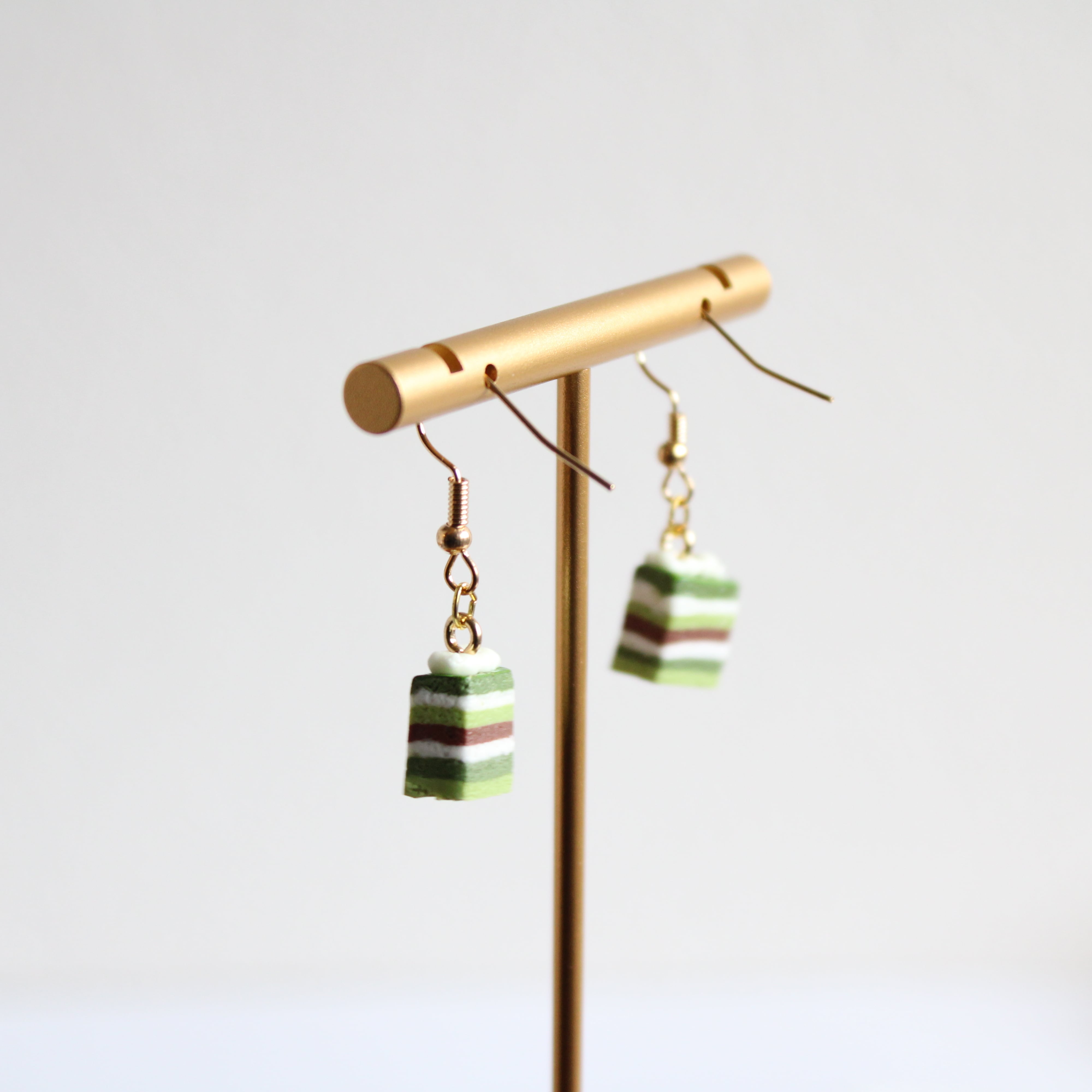 抹茶のオペラケーキピアス - 美味しさと芸術が融合したアクセサリー(ピアス / イヤリング/チャーム/ストラップ/キーホルダー) ミニチュア スイーツ ハンドメイド作品