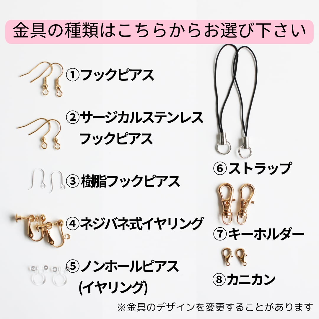 金具はピアス・イヤリング・ストラップなど様々ご用意しています