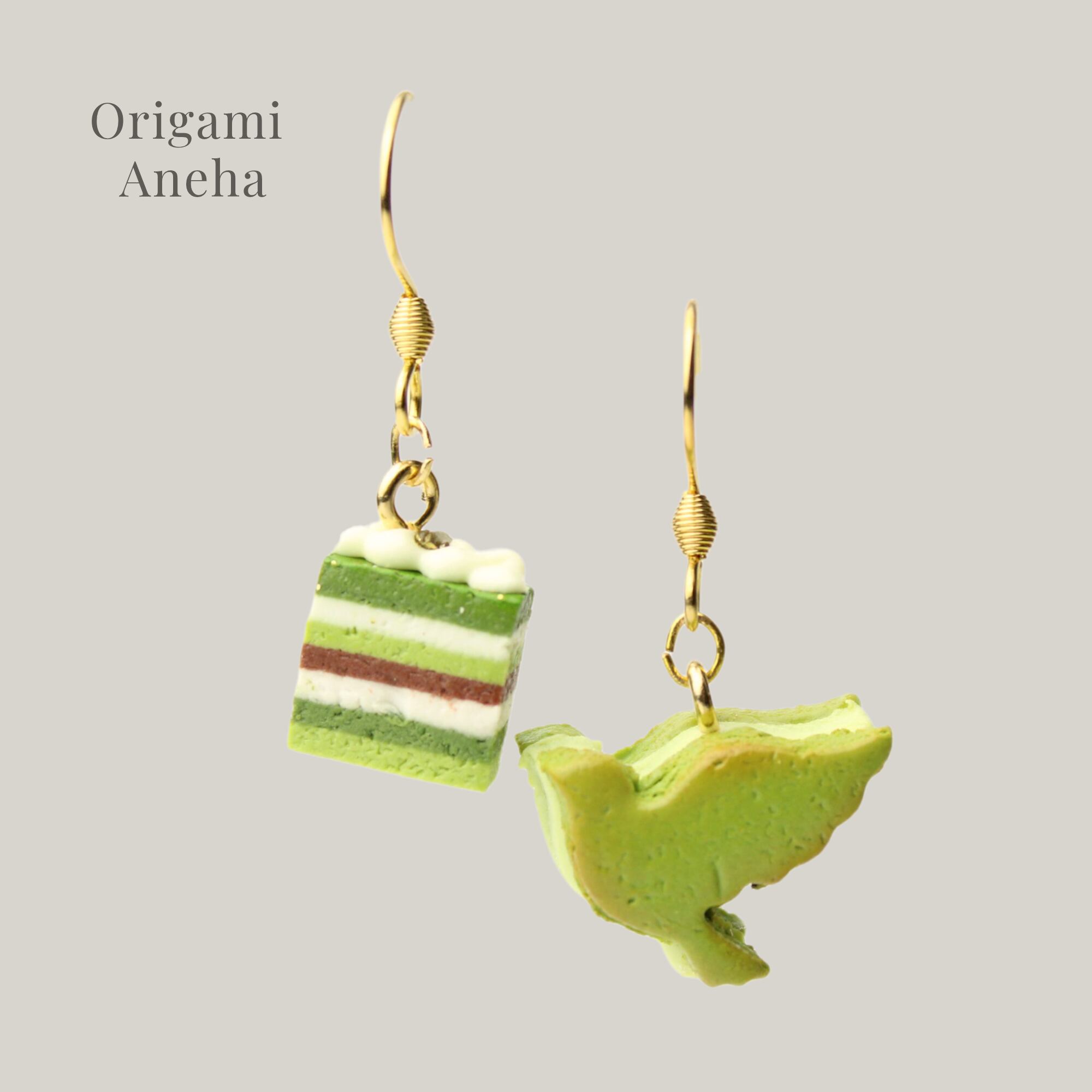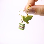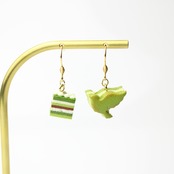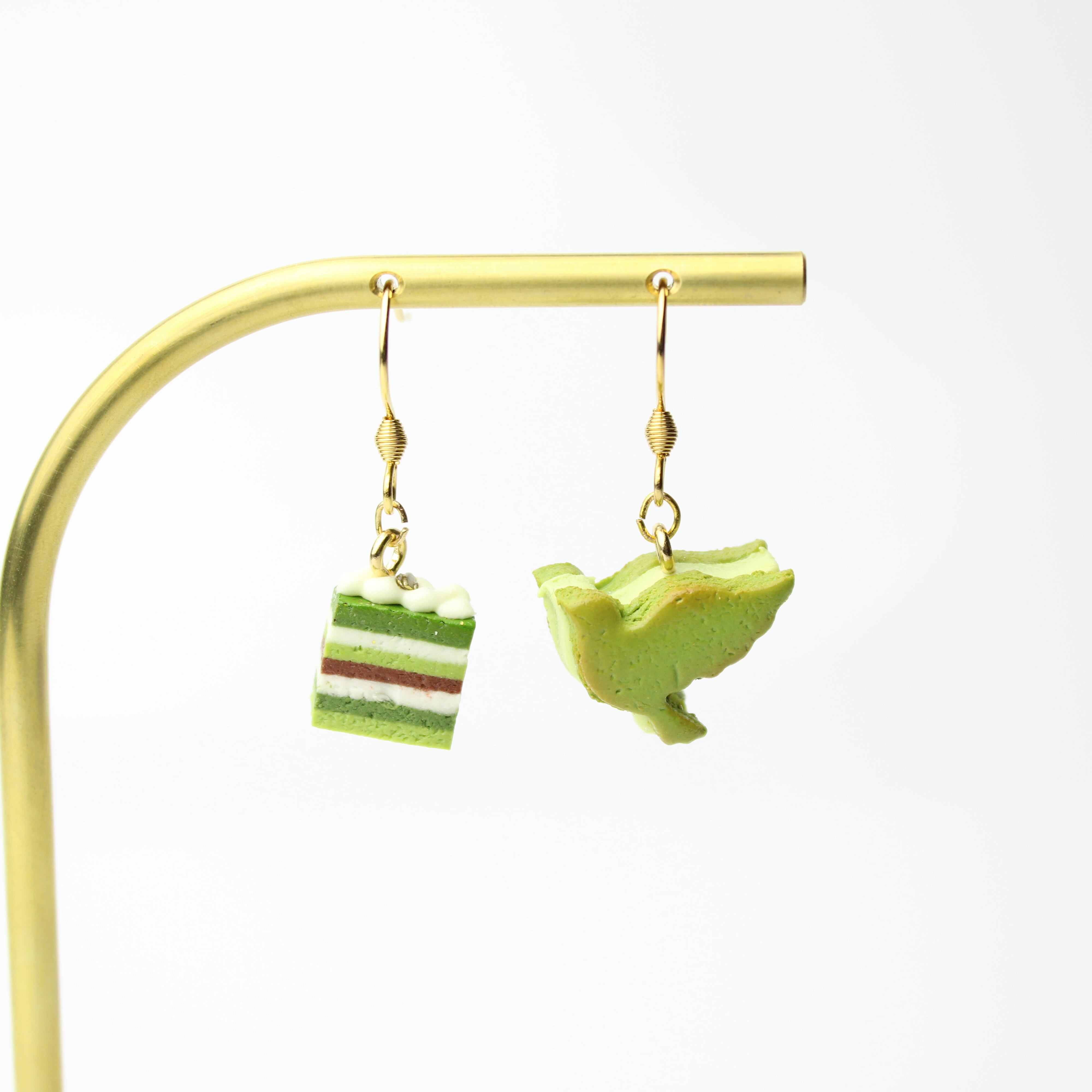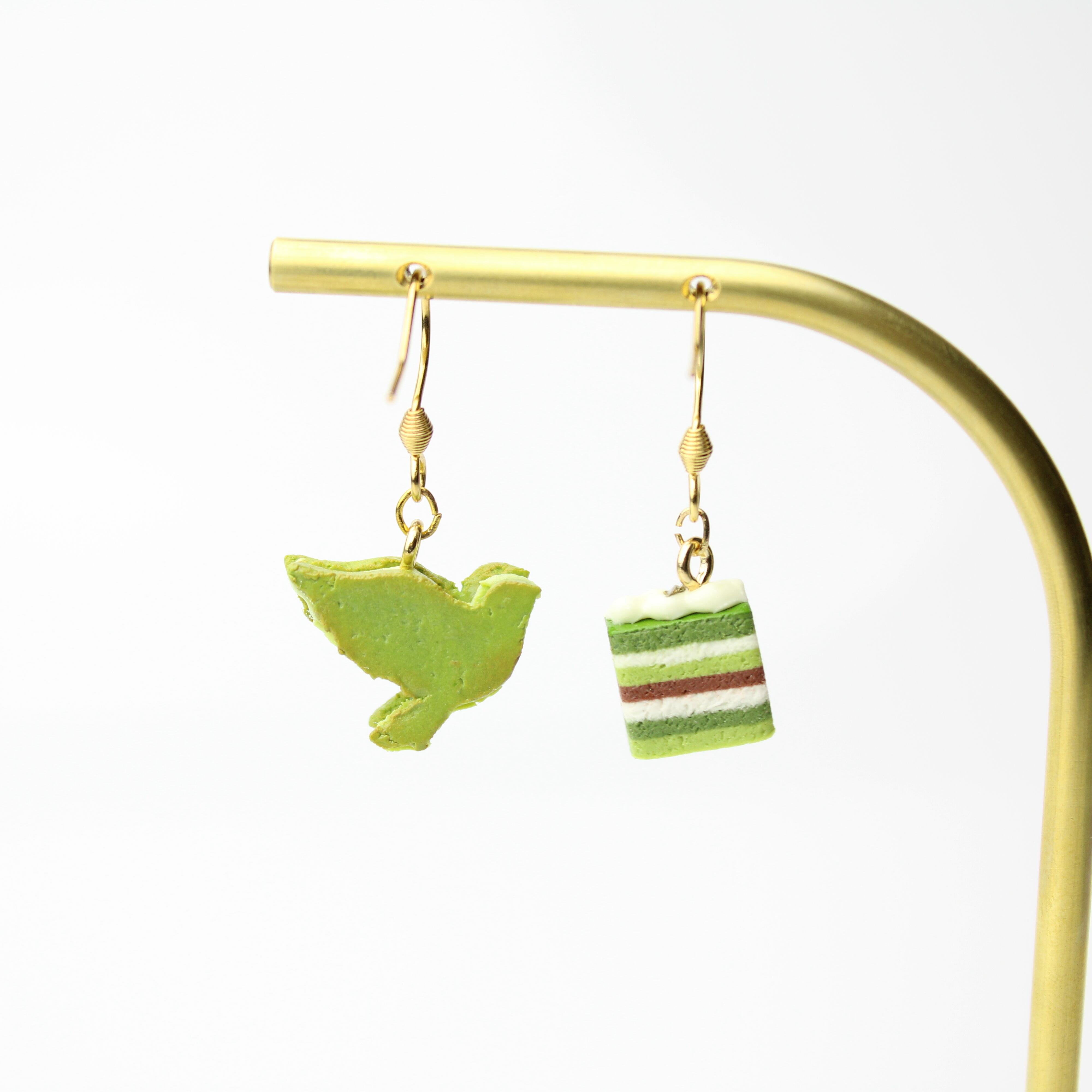 抹茶のオペラケーキと鳥のバターサンドピアス (ピアス / イヤリング/チャーム/キーホルダー) ミニチュア スイーツ フェイクフード ハンドメイド作品