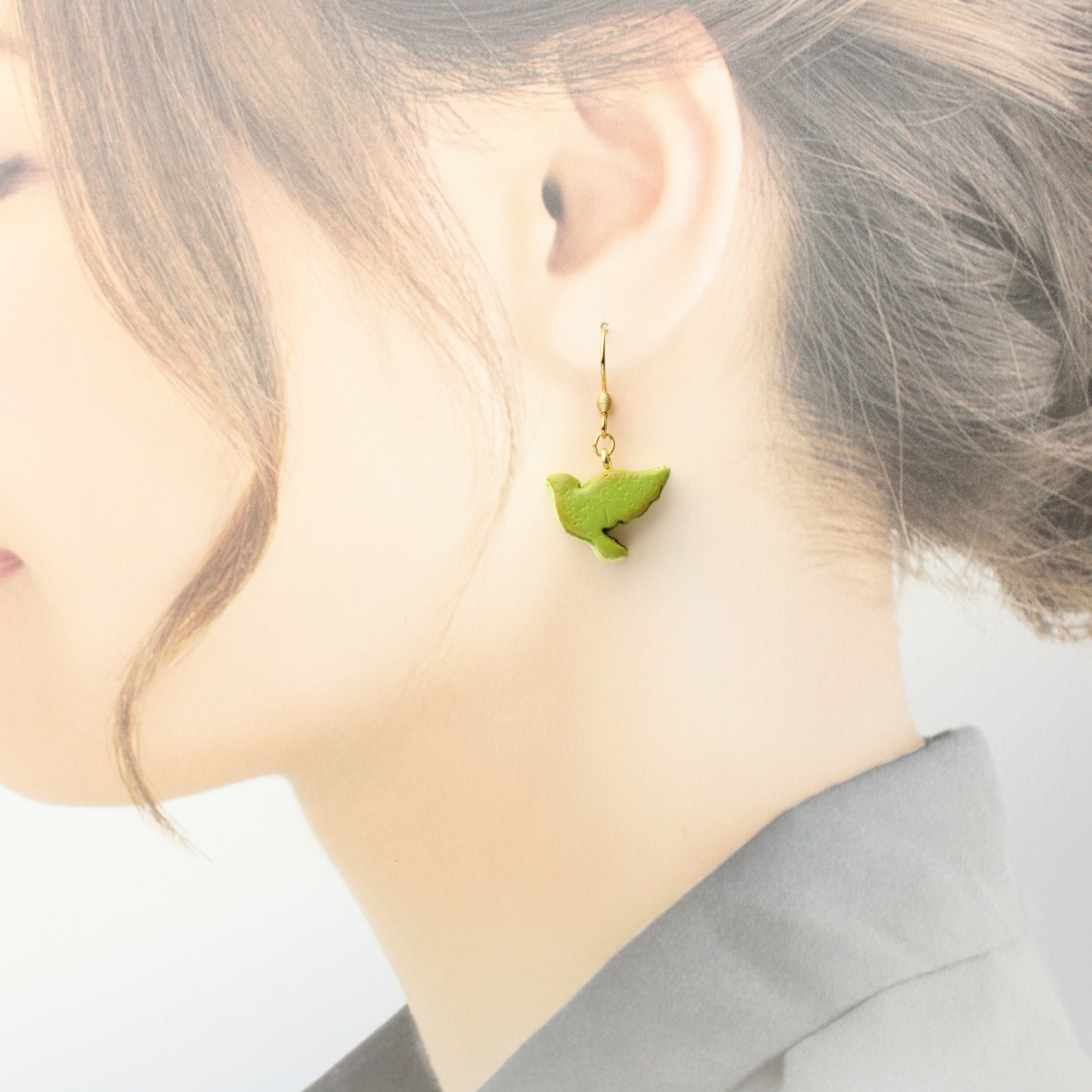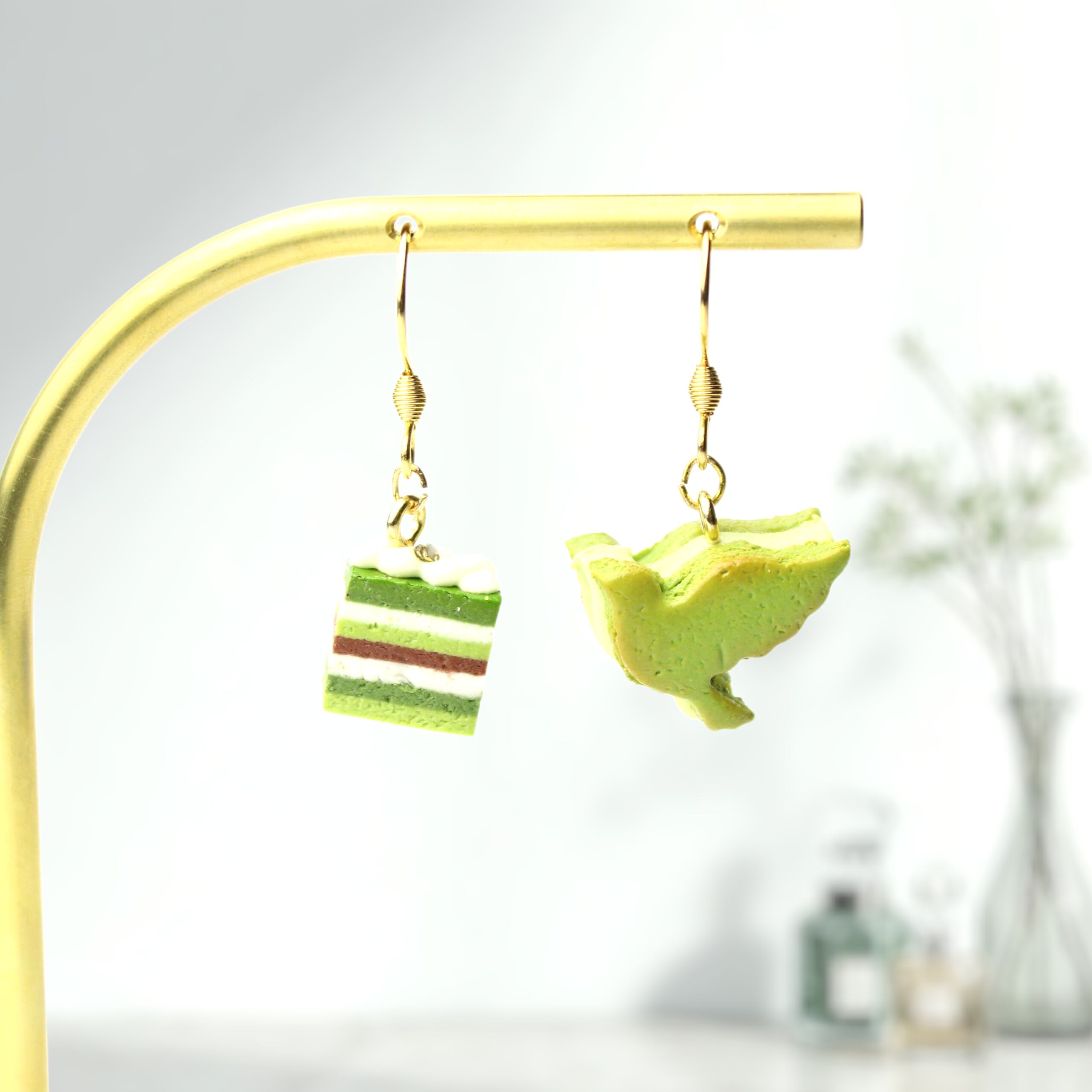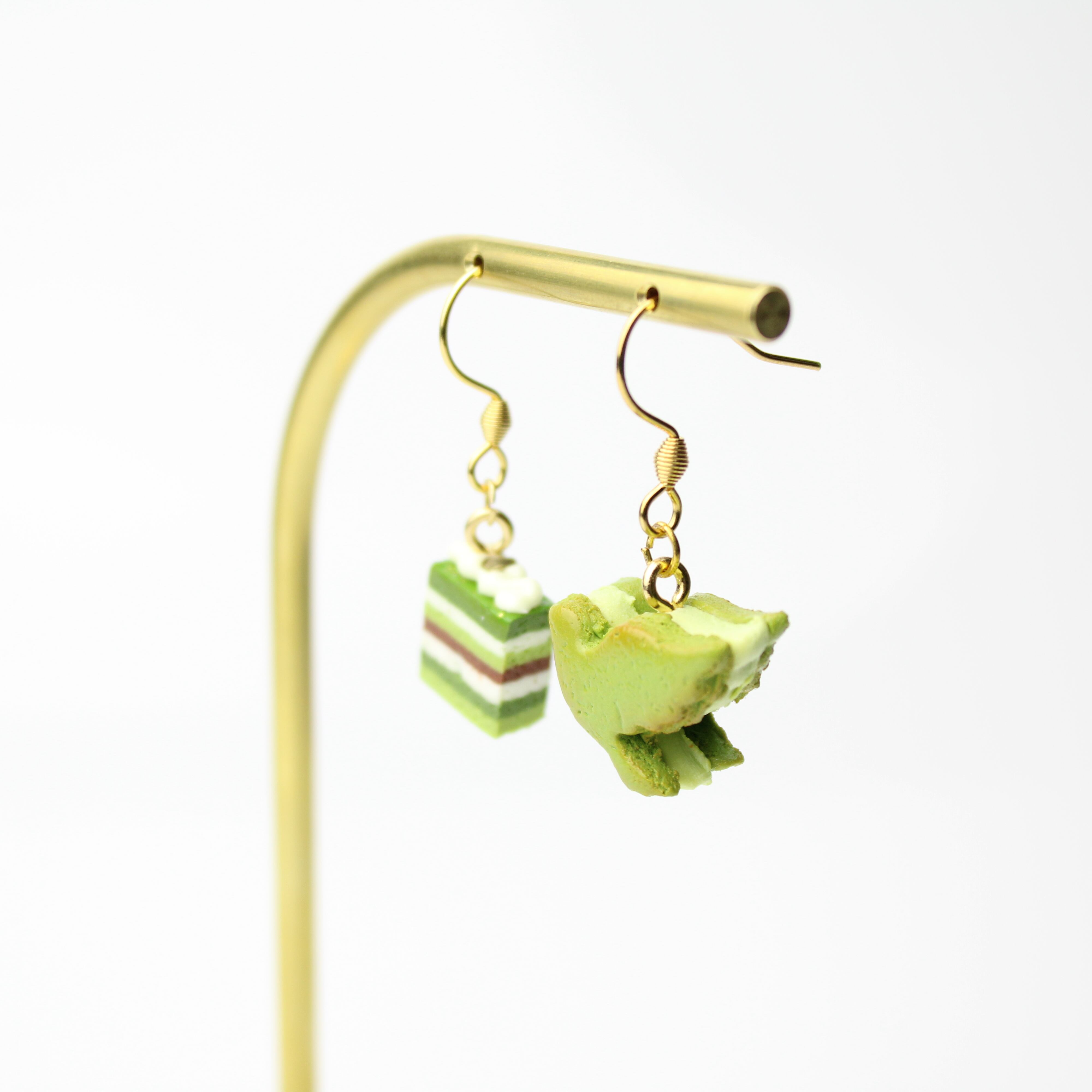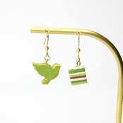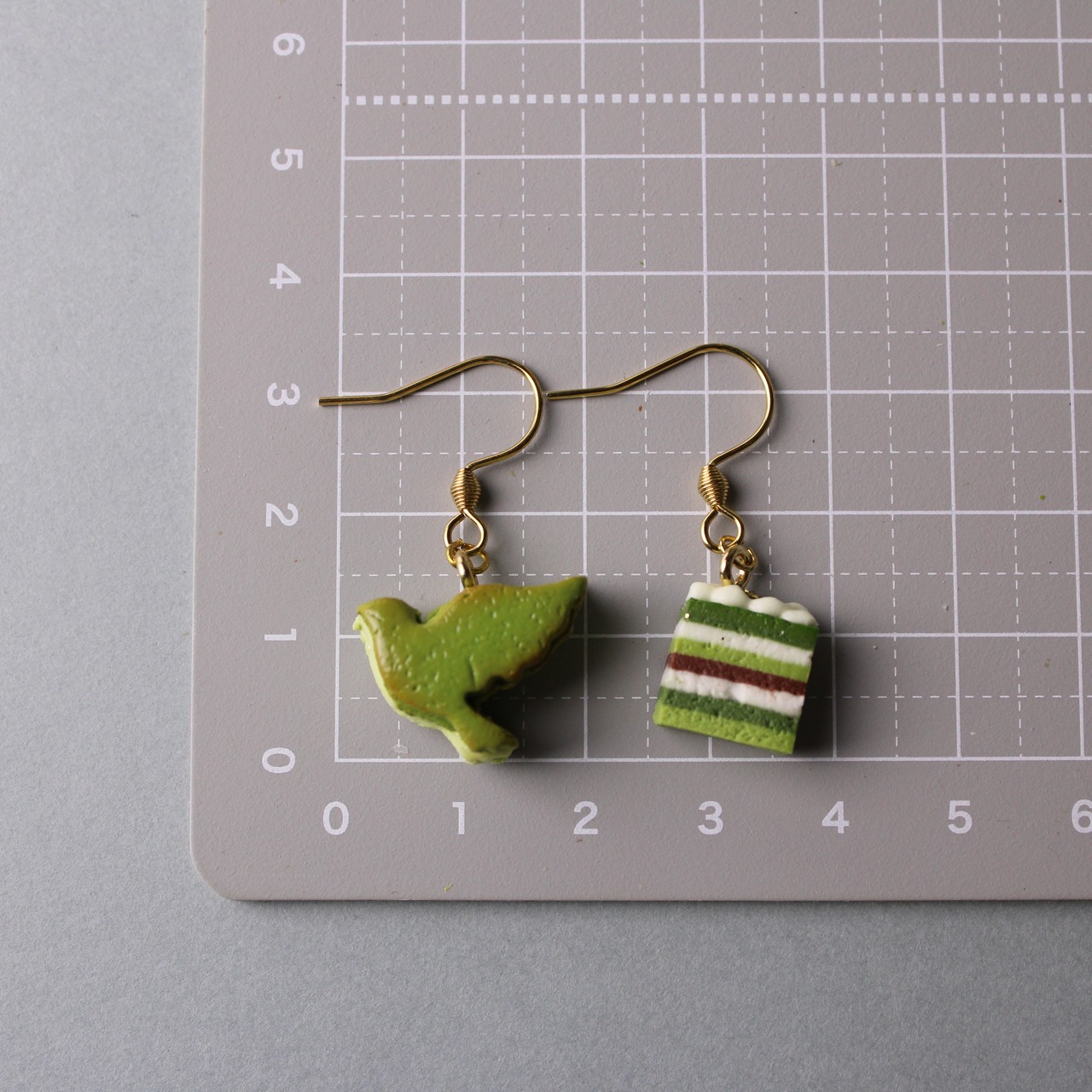 抹茶のオペラケーキと鳥のバターサンドピアス (ピアス / イヤリング/チャーム/キーホルダー) ミニチュア スイーツ フェイクフード ハンドメイド作品
