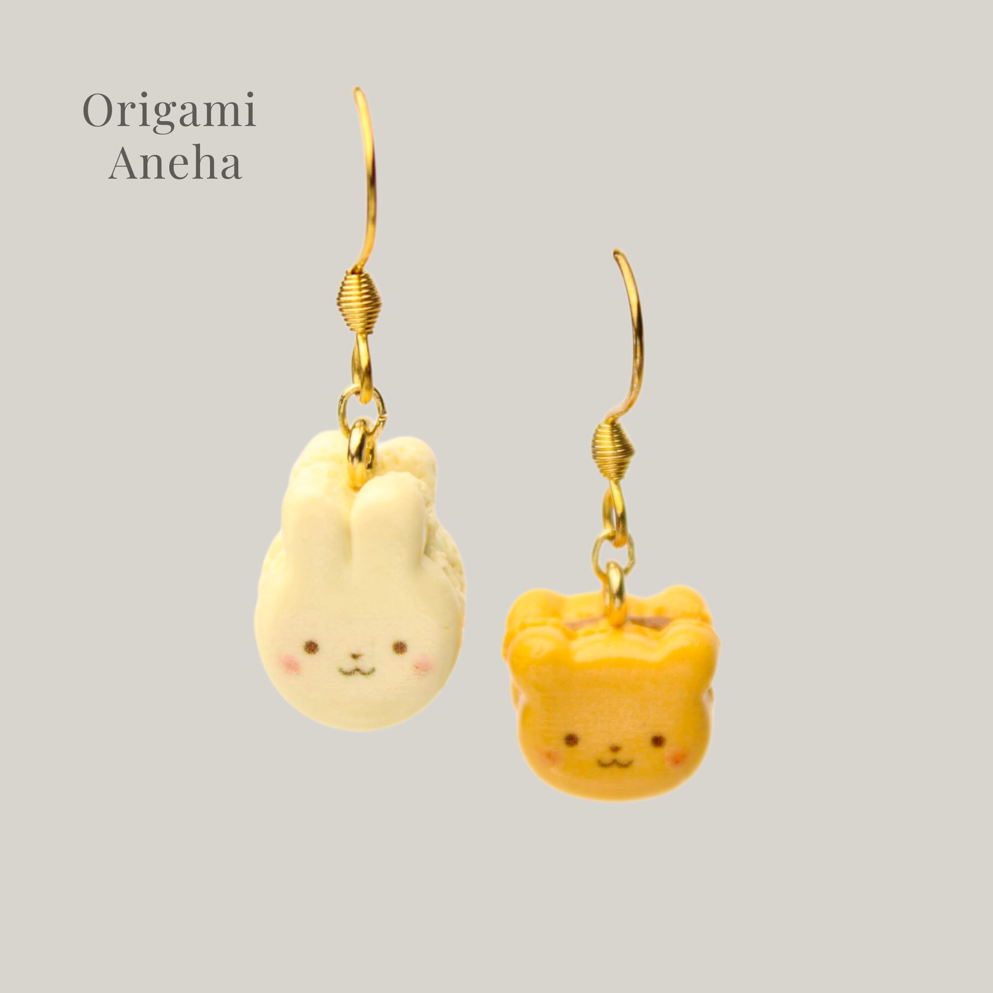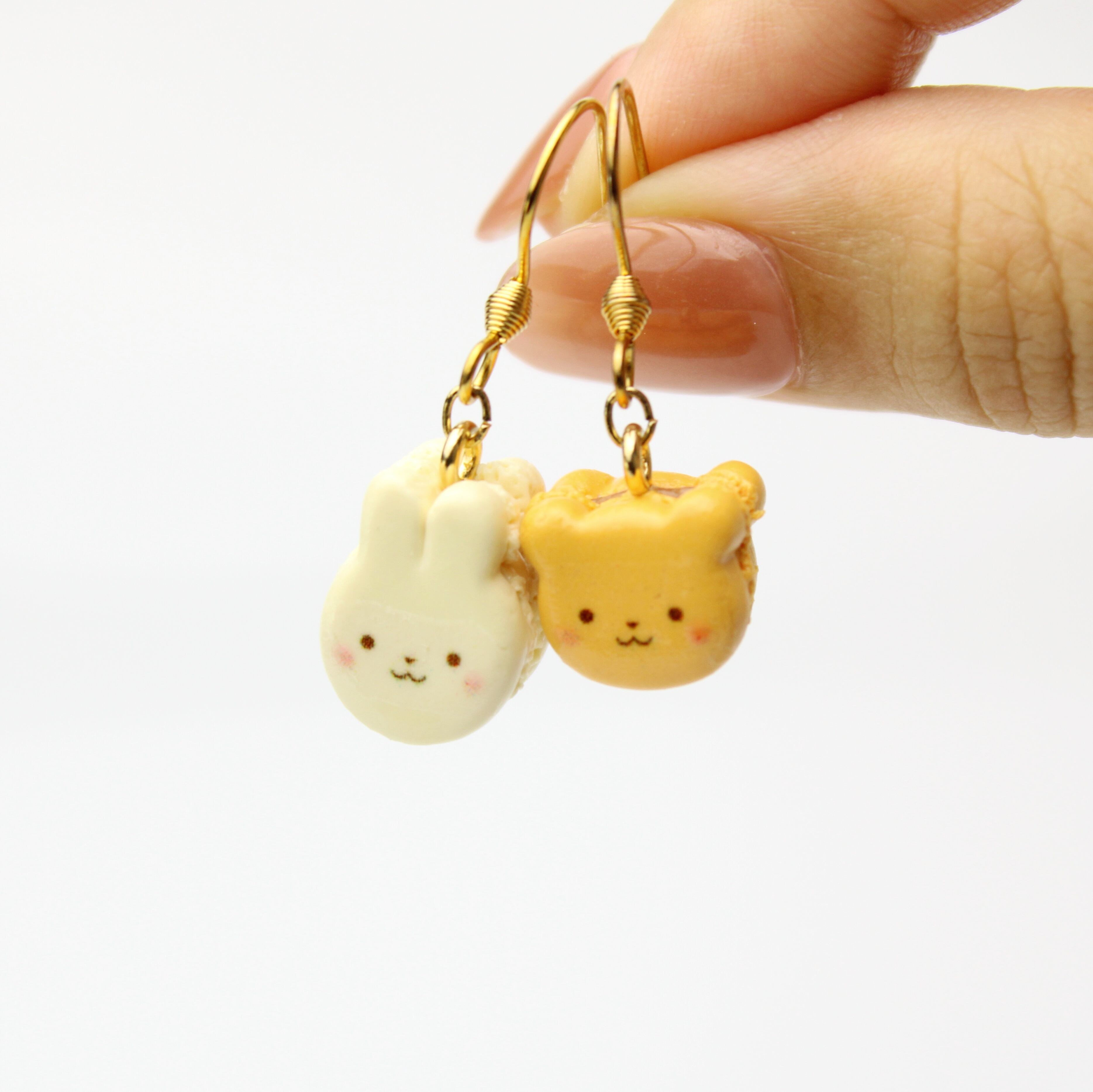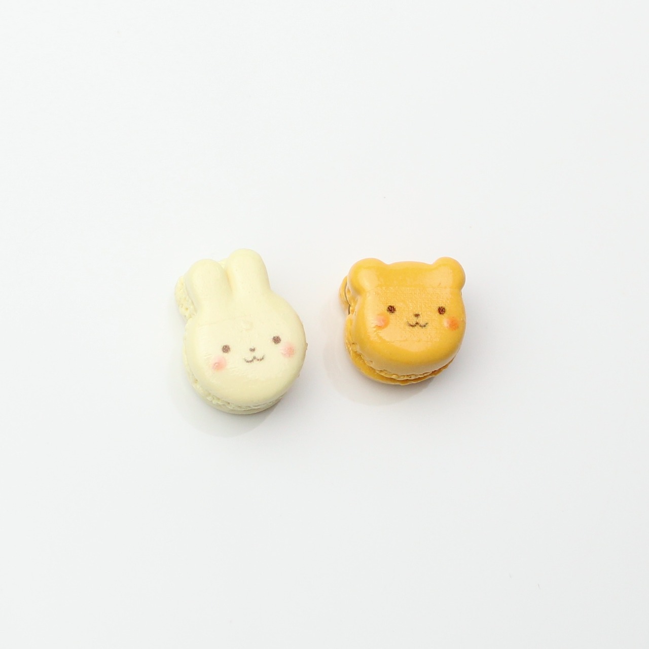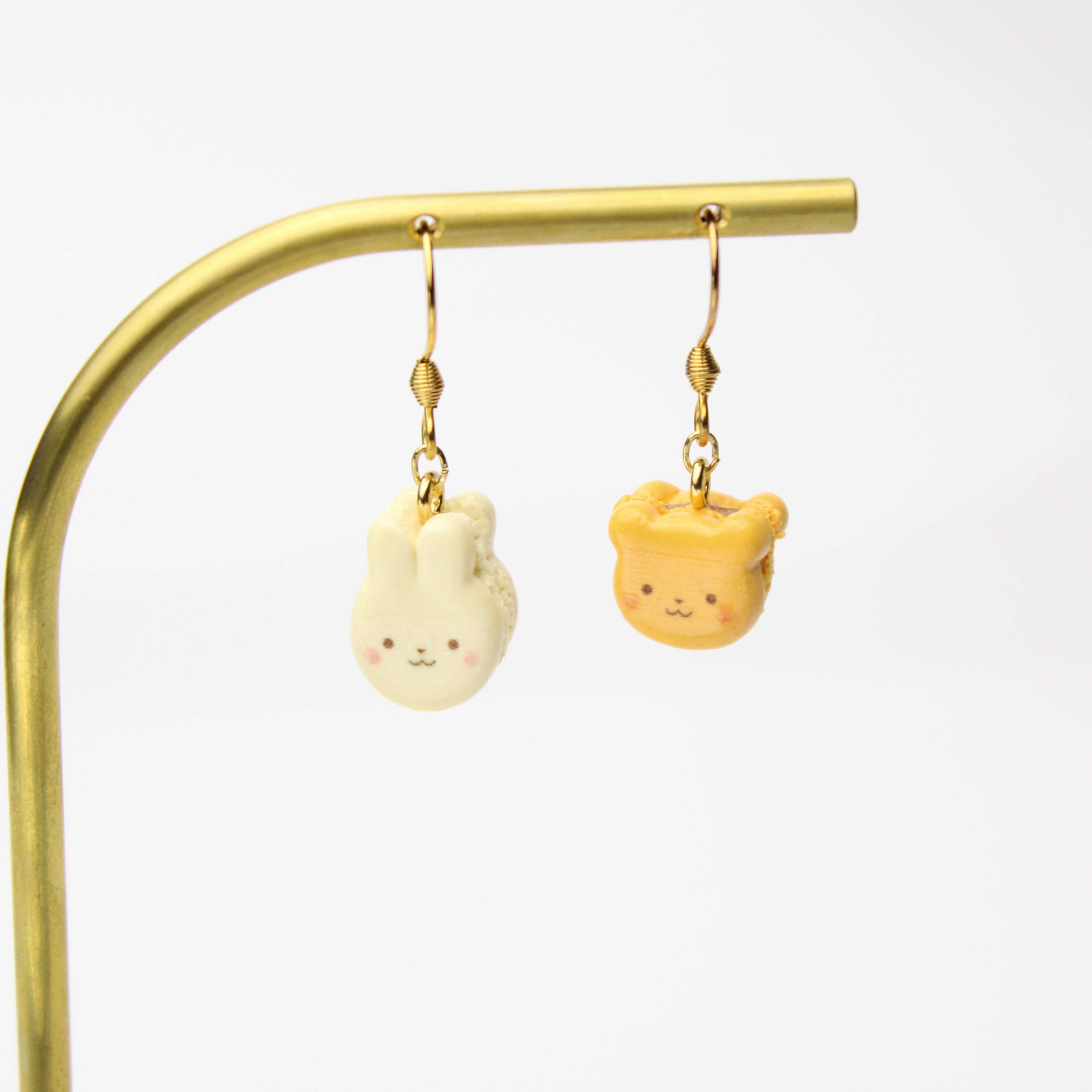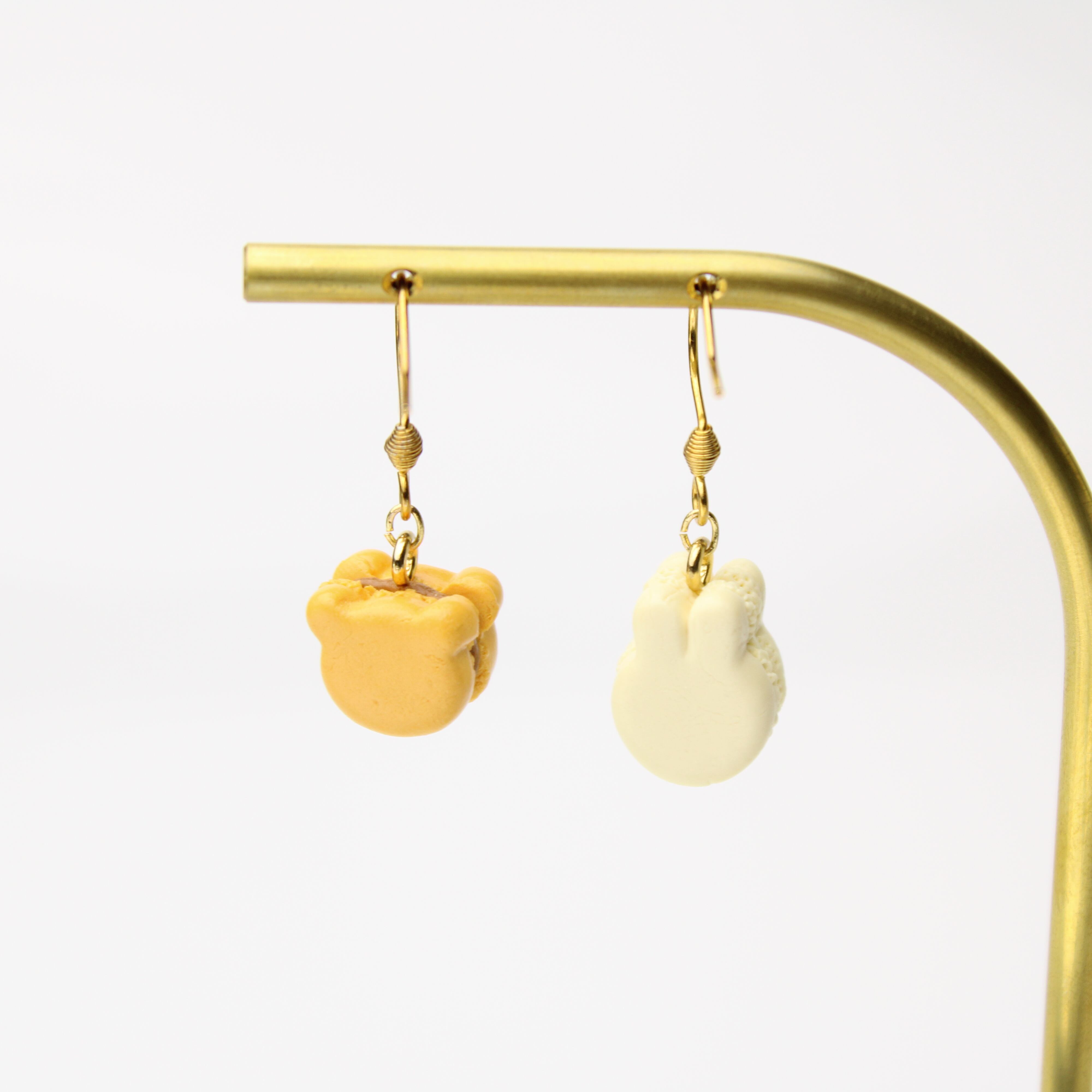 キャラメルくまと、ほうじ茶ホワイトチョコうさぎのマカロンセット(ピアス・イヤリング・チャーム) ― 耳元に、甘いご褒美を ハンドメイド作品
