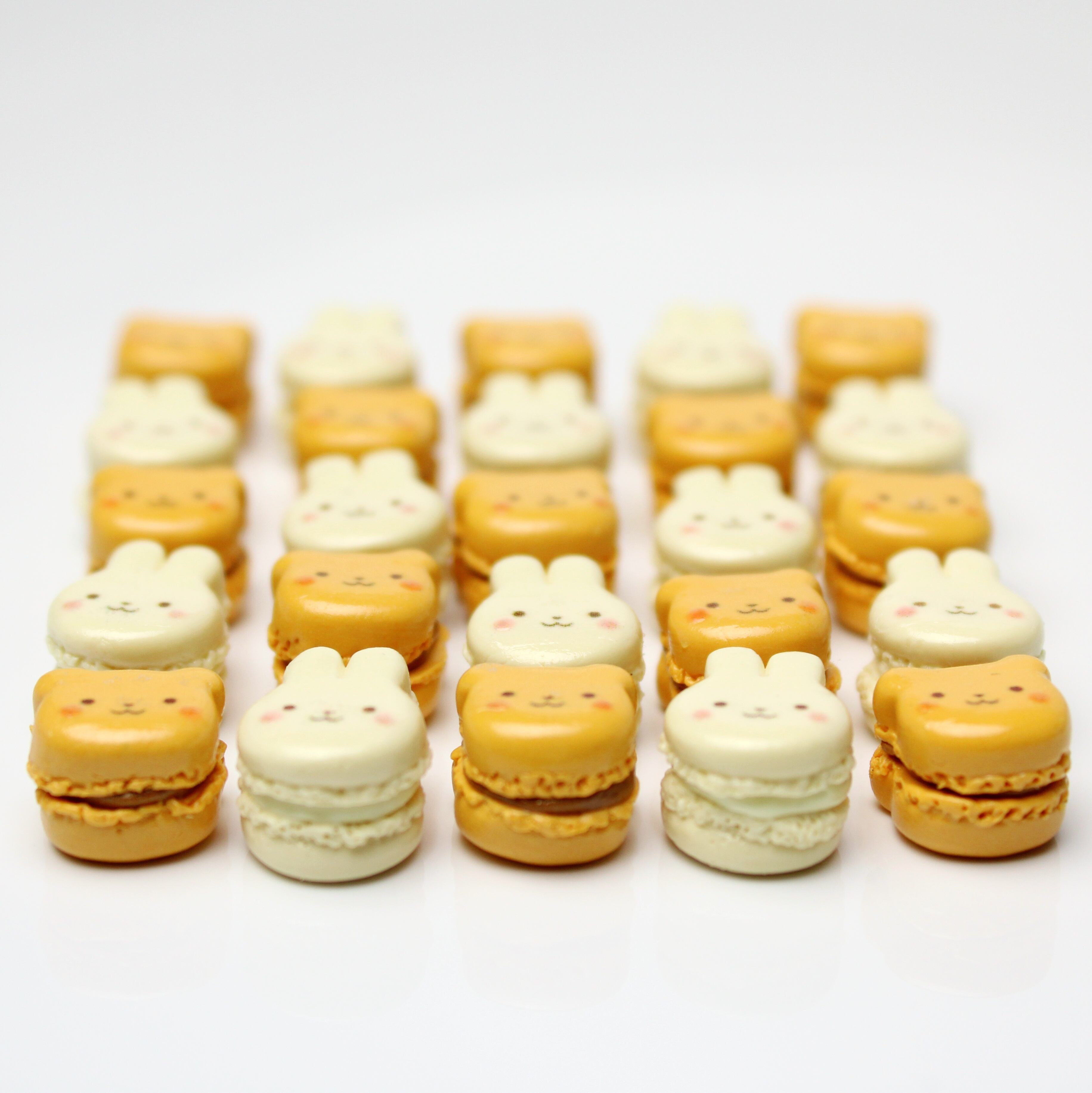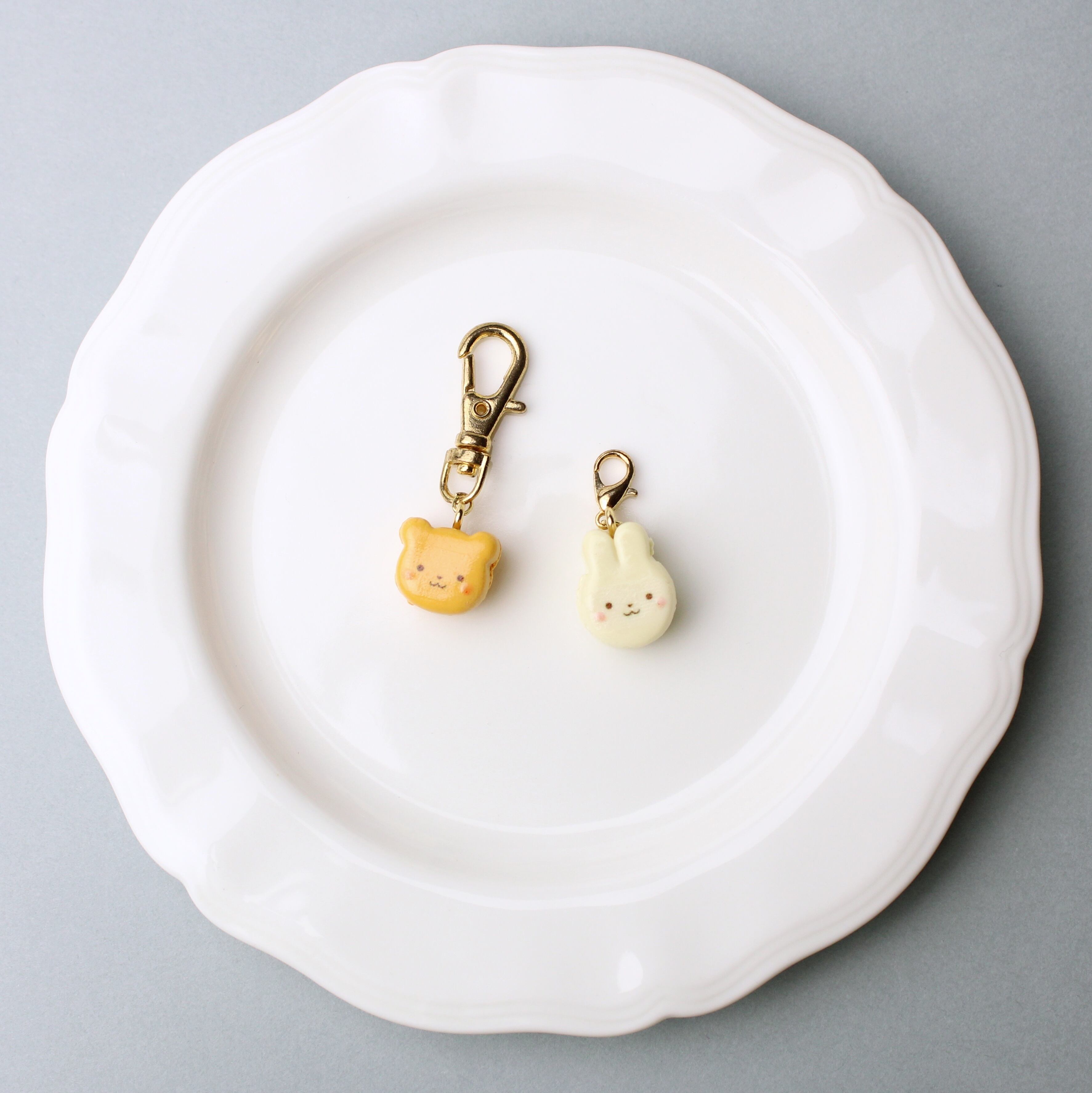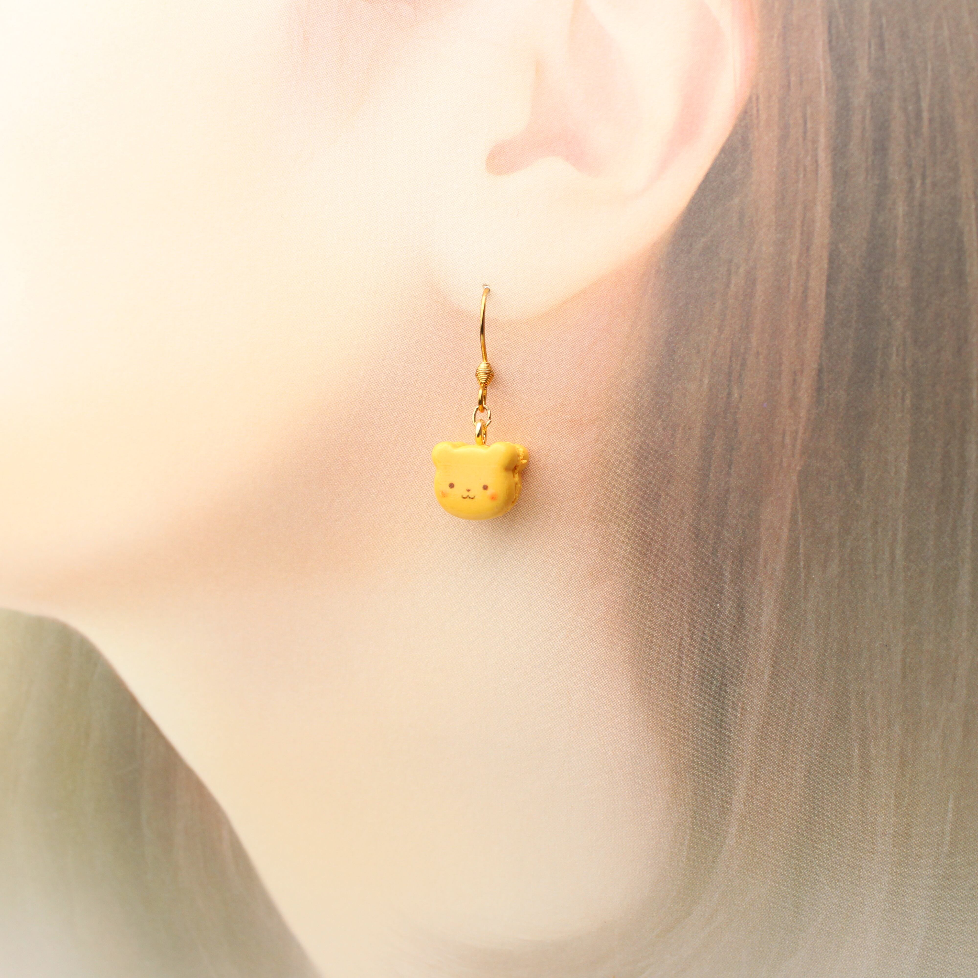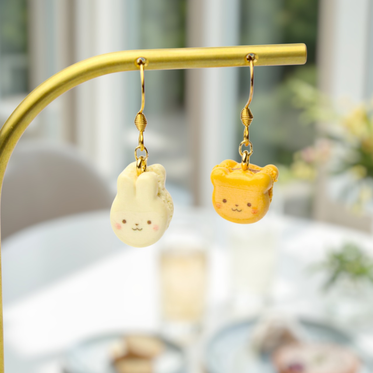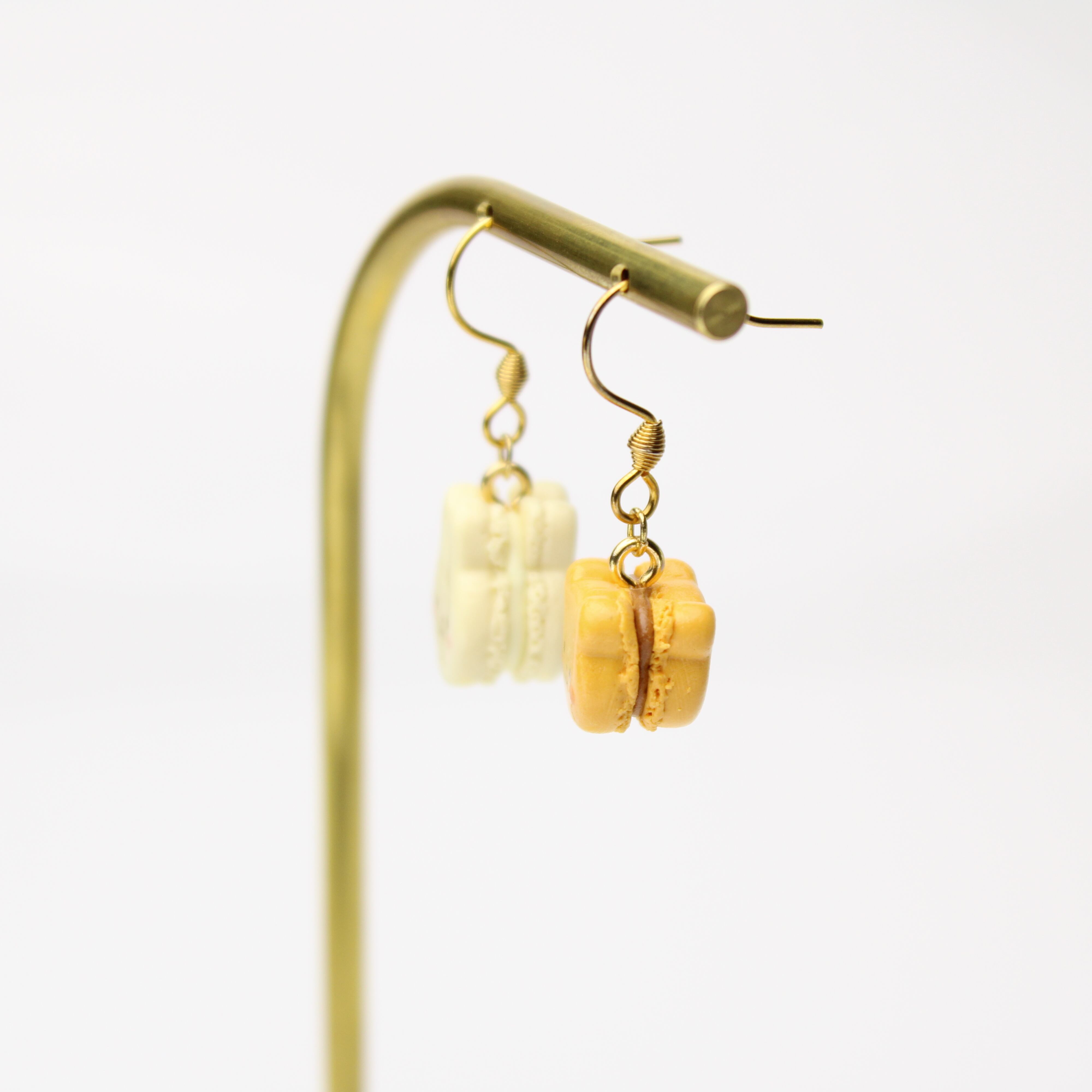 キャラメルくまと、ほうじ茶ホワイトチョコうさぎのマカロンセット(ピアス・イヤリング・チャーム) ― 耳元に、甘いご褒美を ハンドメイド作品
