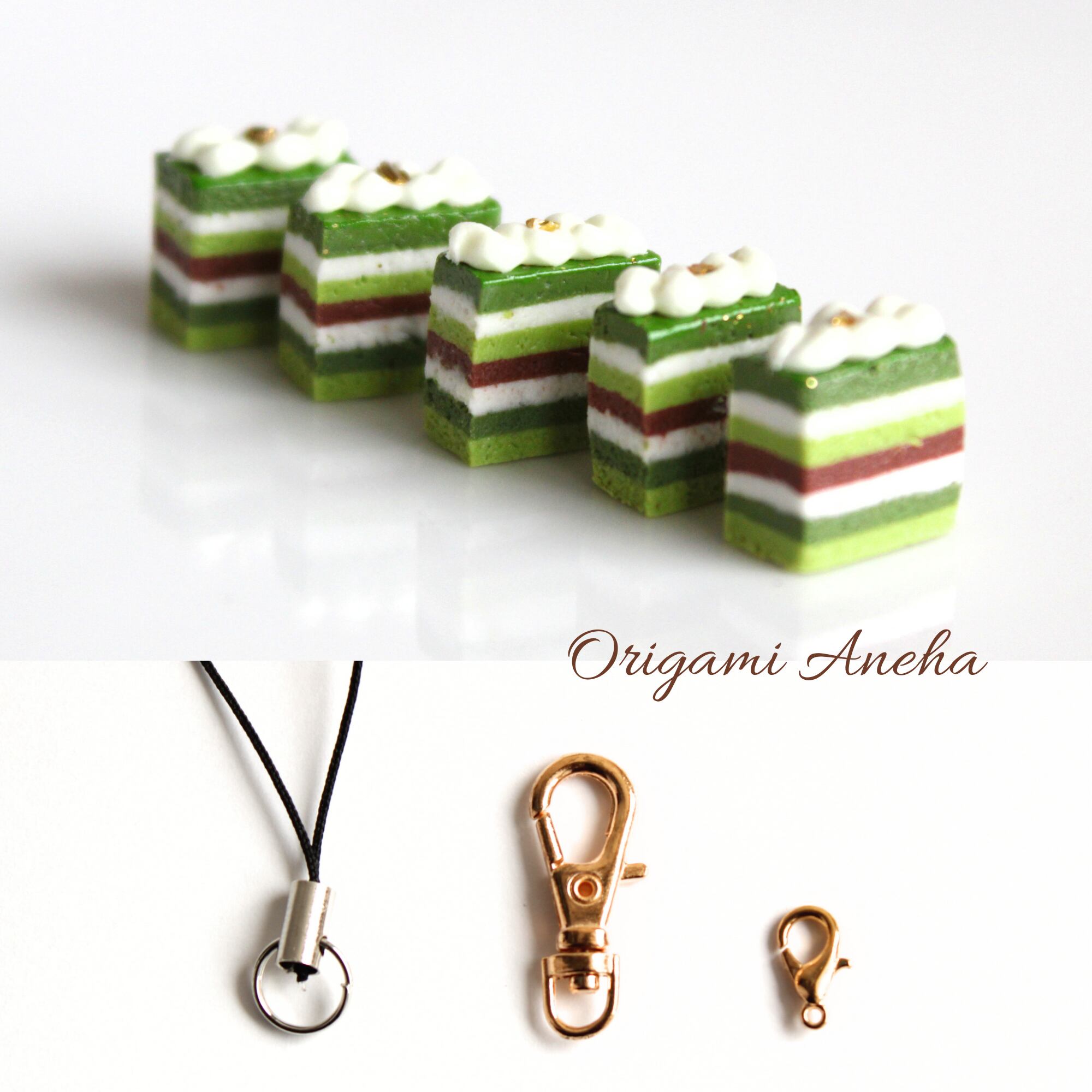 【選べる・金具/無し可】抹茶のオペラケーキ 見るだけでなく持ち運べる小さな芸術作品( チャーム ストラップ キーホルダー )ミニチュア スイーツ フェイクフード ハンドメイド作品