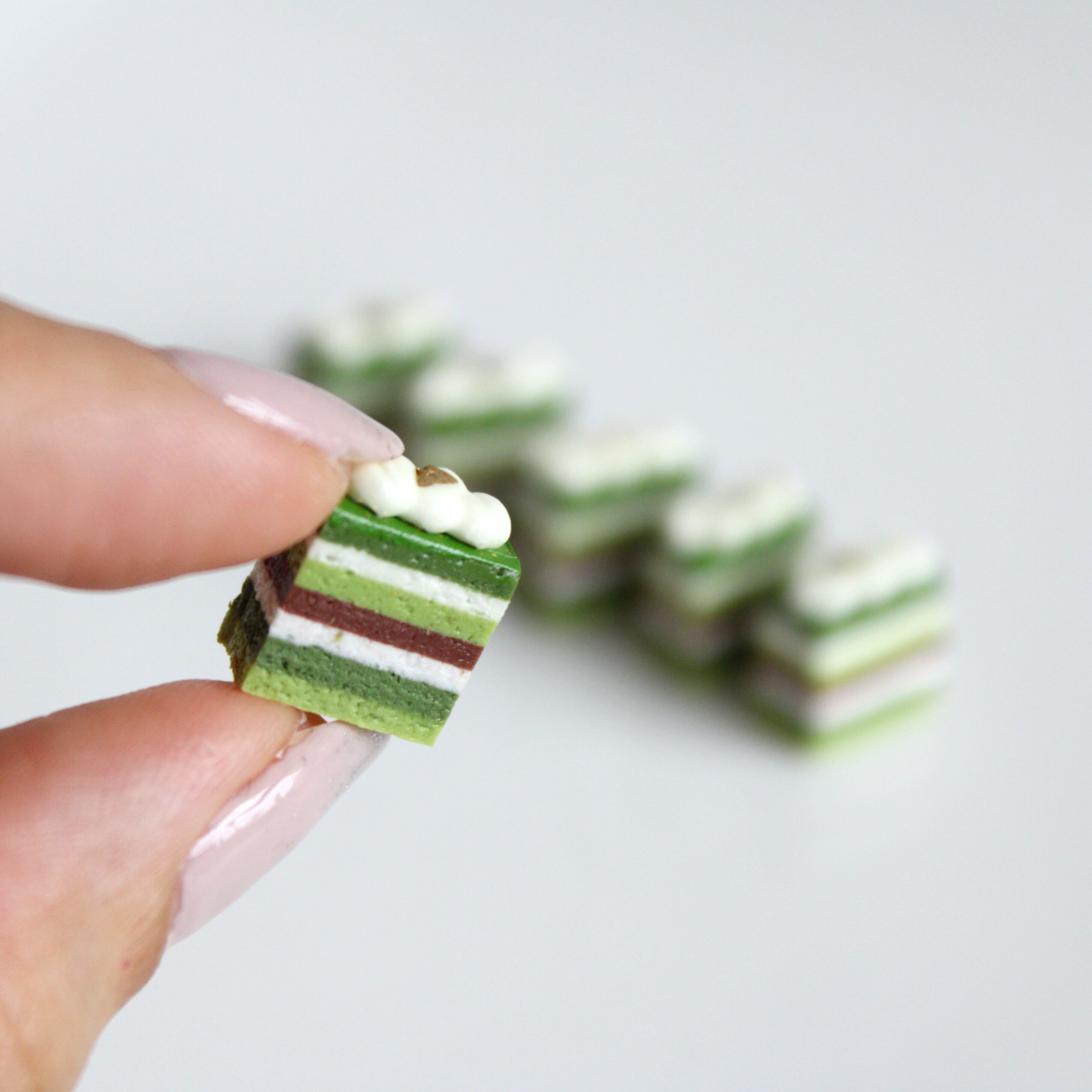 この抹茶のオペラケーキは樹脂粘土や絵の具などを使用し、細部までこだわり仕上げました
