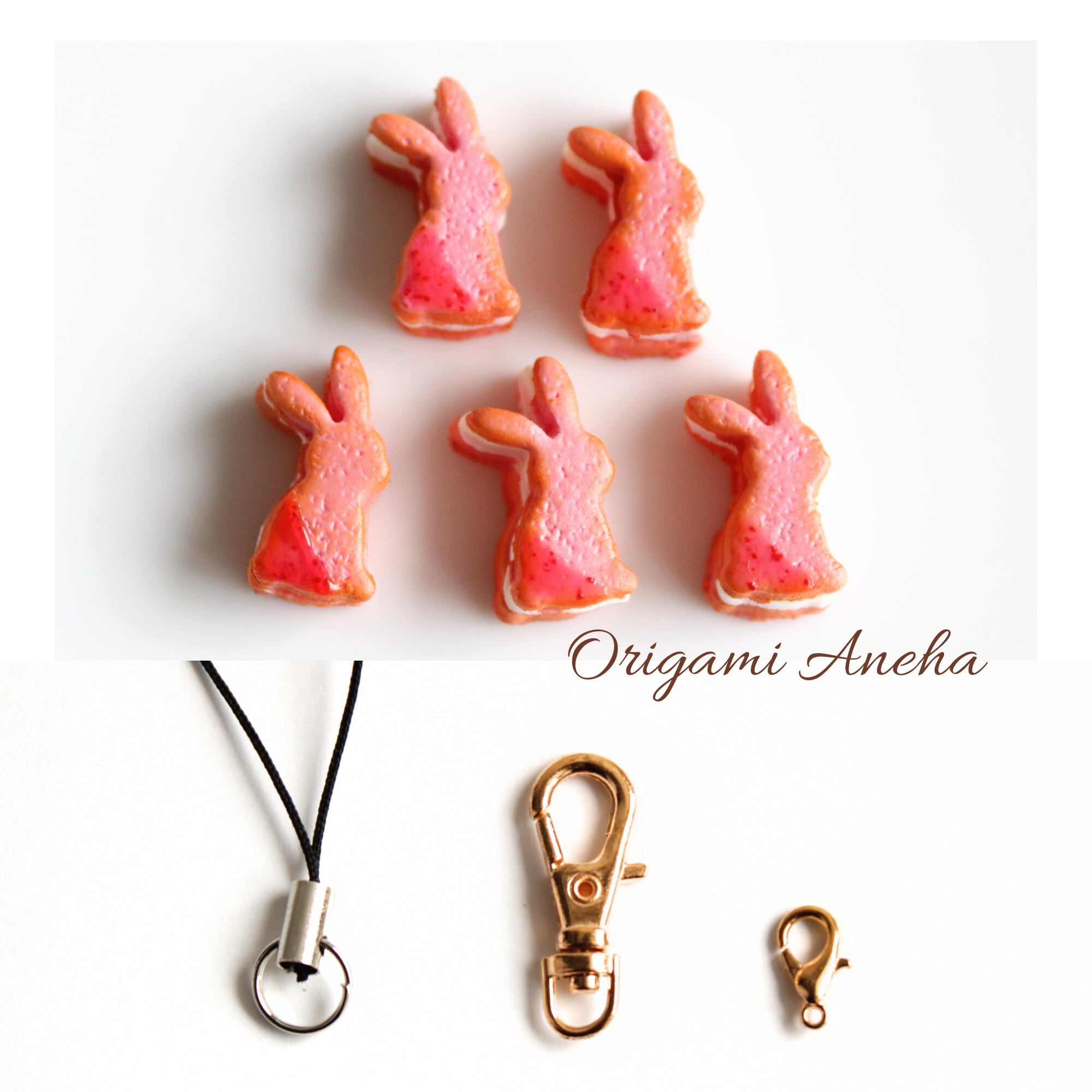 【選べる・金具/無し可】幸せのうさぎ 苺バターサンドクッキー( チャーム ストラップ キーホルダー )ミニチュア ハンドメイド作品